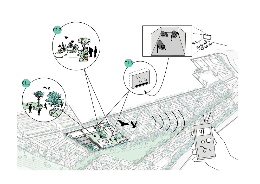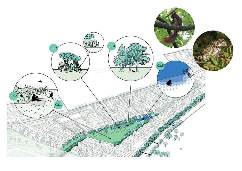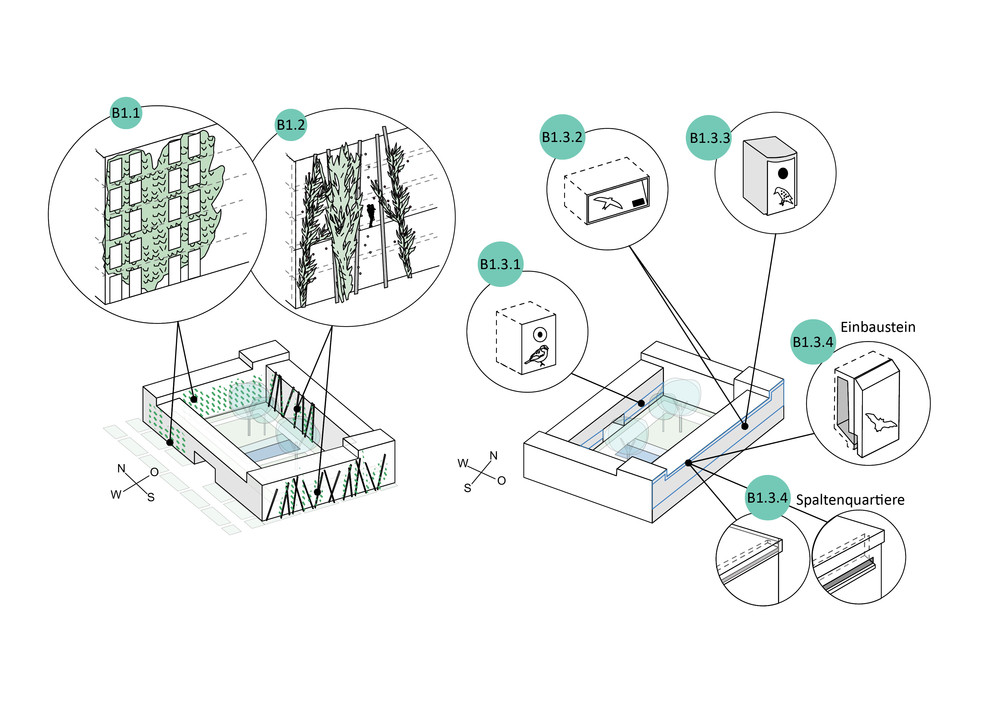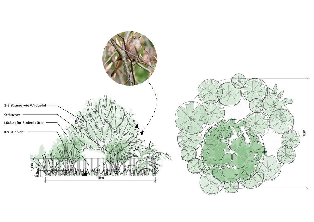 Angesichts des anhaltenden Städtewachstums ist ein aktives Einbinden von biodiversitätsfördernden Maßnahmen in städtische Planungsprozesse von entscheidender Bedeutung, um städtische Natur und ihre Ökosystemleistungen in der Stadt zu erhalten. Mit dem Bau von ca. 5.000 Wohneinheiten für 10.000 Menschen im Schumacher Quartier soll erstmals in Berlin auch konkret neuer Lebensraum für ausgewählte Zielarten geschaffen und die Lebensbedingungen für weitere profitierende Arten verbessert werden. Mit dem Animal-Aided Design Konzept werden die Tierbedürfnisse in die Stadt- und Freiraumplanung eingebunden. So lassen sich nicht nur wertvolle Nischen für Vögel, Reptilien, Insekten oder Säugetiere schaffen – auch die Lebensqualität der Städter steigt. Mit dem Projekt wurden 14 Zielarten ausgewählt, die aus Naturschutzgründen gefördert werden sollen, aber auch besondere und positive Erlebnisse für die Nutzer*innen der Freiräume und die Bewohner*innen des neuen Stadtquartiers mit sich bringen. Ein Maßnahmenkatalog benennt die für die Förderung der Tiere notwendigen Elemente, wie z.B. blau-grüne Biodiversitätsdächer und artspezifische Fassadenquartiere.