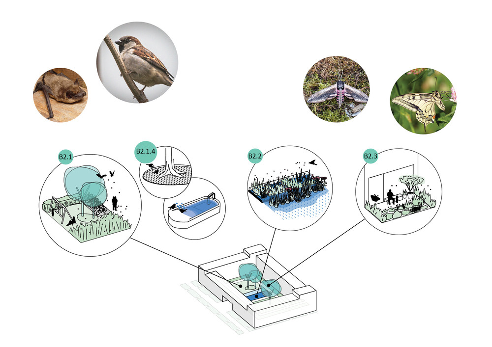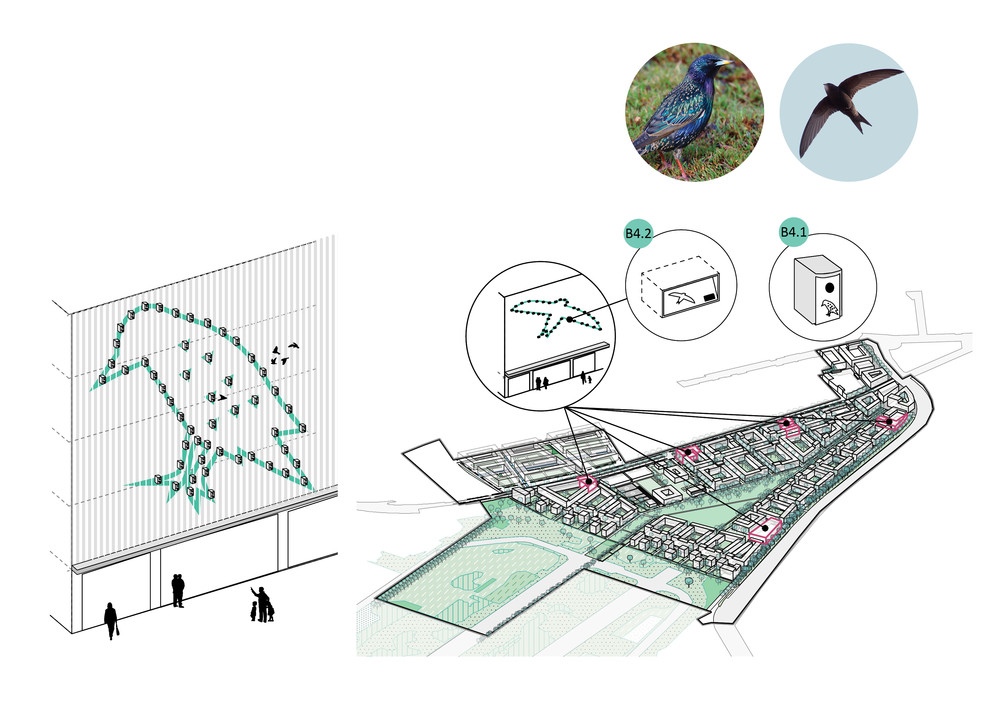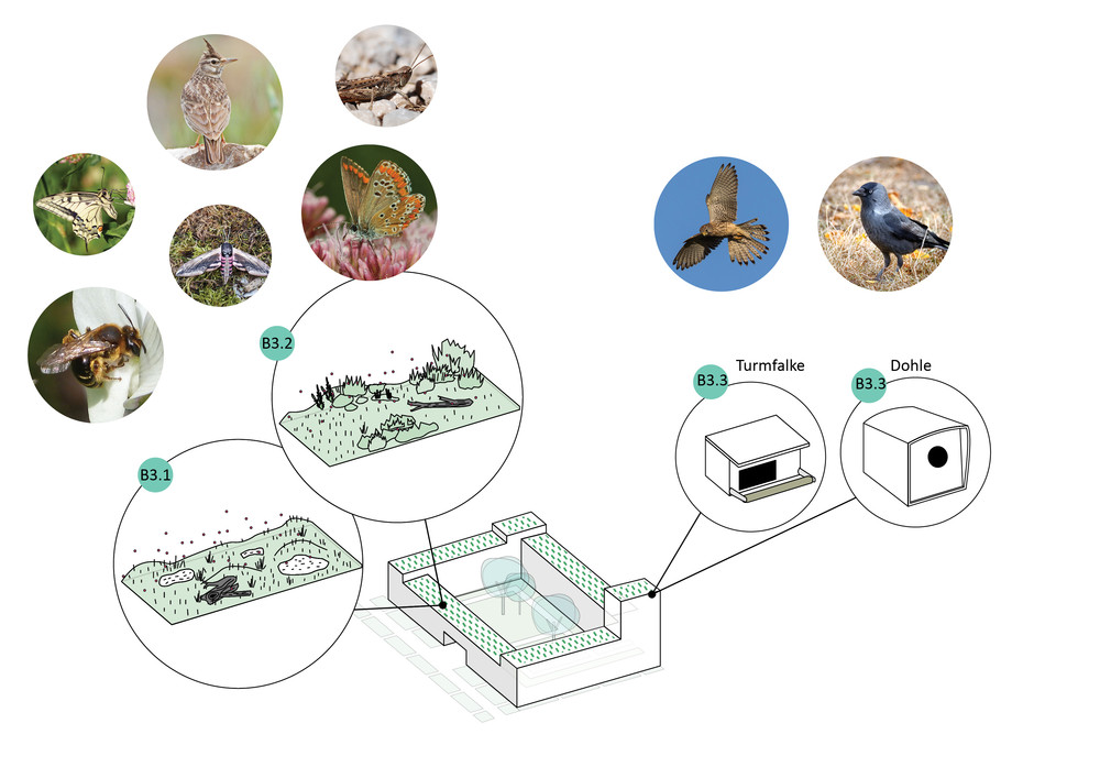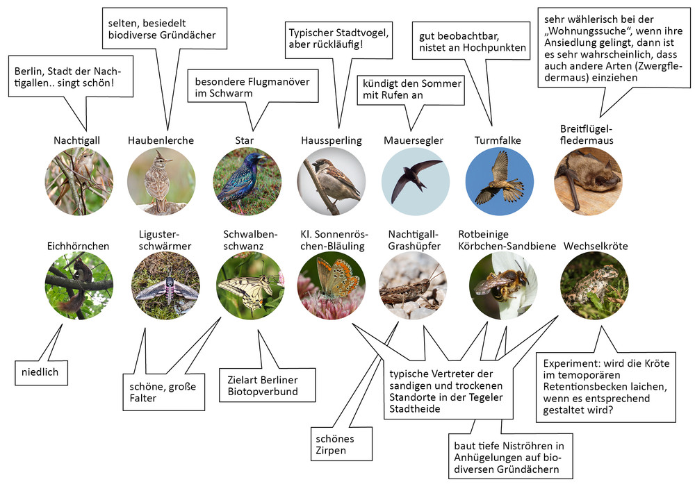 | Bildnachweis | Bgmr und Studio AAD; basierend auf Rahmenplan Schumacher Quartier Stand 2018 von scheuvens + wachten; Fotos via flickr: Dohle: hedera.baltica [CC BY-SA 2.0], Haubenlerche: vil.sandi [CC BY-ND 2.0]; Haussperling: hedera.baltica [CC BY 2.0]; Mauersegler: pau.artigas [CC BY-SA 2.0]; Nachtigall: Ron Knight, [CC BY 2.0]; Star: Stefan Berndtsson [CC BY 2.0]; Turmfalke: Smudge 9000 [CC BY-SA 2.0]; Schwalbenschwanz: Jörg Hempel [CC BY-SA 2.0]; Kleiner Sonnenröschen-Bläuling: Ettore Balocchi [CC BY 2.0]; Ligusterschwärmer: Ben Sale [CC BY 2.0]; Nachtigall-Grashüpfer San Martin [CC BY-SA 2.0)]; Fotos via wiki commons: Breitflügelfledermaus: Mnolf [GFDL, CC-BY-SA-2.0], Wechselkröte: Konstakal [CC BY-SA 4.0]; Rotbeinige Körbchen-Sandbiene: gailhampshire [CC BY 2.0]; Eichhörnchen: Lindschulte |
