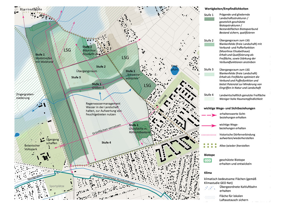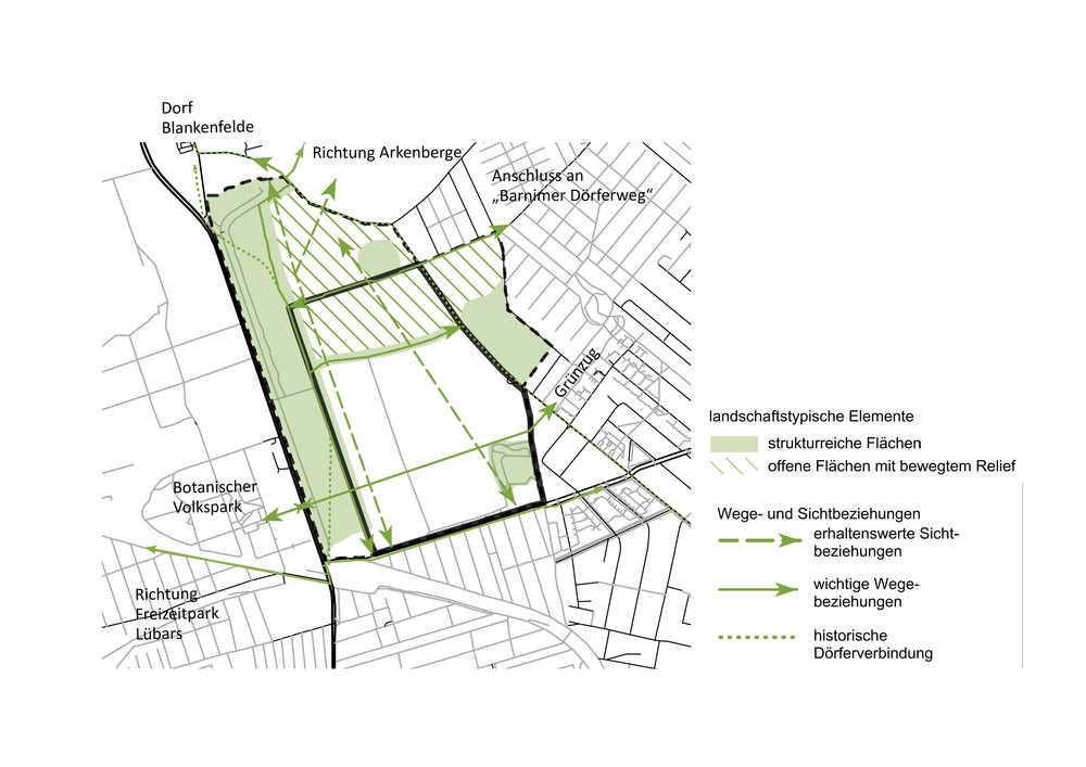 Hintergrund war die Planung eines Stadtquartiers mit 5.000 Wohnungen auf dem 70 ha großen, landwirtschaftlich geprägten Areal in Berlin Pankow. Um diese Entwicklung möglichst von negativen Auswirkungen auf Umwelt und Landschaftserleben zu entkoppeln, wurde die landschaftsökologische Untersuchung durchgeführt, deren Ergebnisse in ein integriertes städtebauliches Entwicklungskonzept (ISEK) flossen. Hierzu wurden Kartierungen zur Flora, Fauna und Landschaftsbild vorgenommen und ein differenziertes Bild über die landschaftsökologischen Wertigkeiten herausgearbeitet. Daraus resultierende Kompensationserfordernisse und Möglichkeiten im Untersuchungsgebiet und dem unmittelbaren Umfeld des LSGs Blankenfelde werden aufgezeigt.