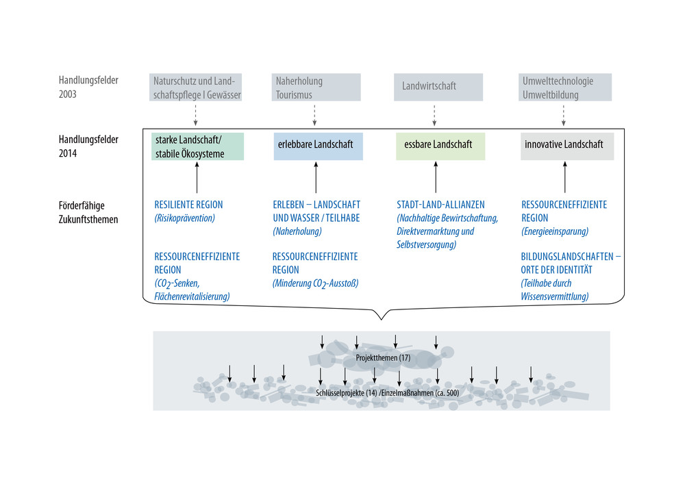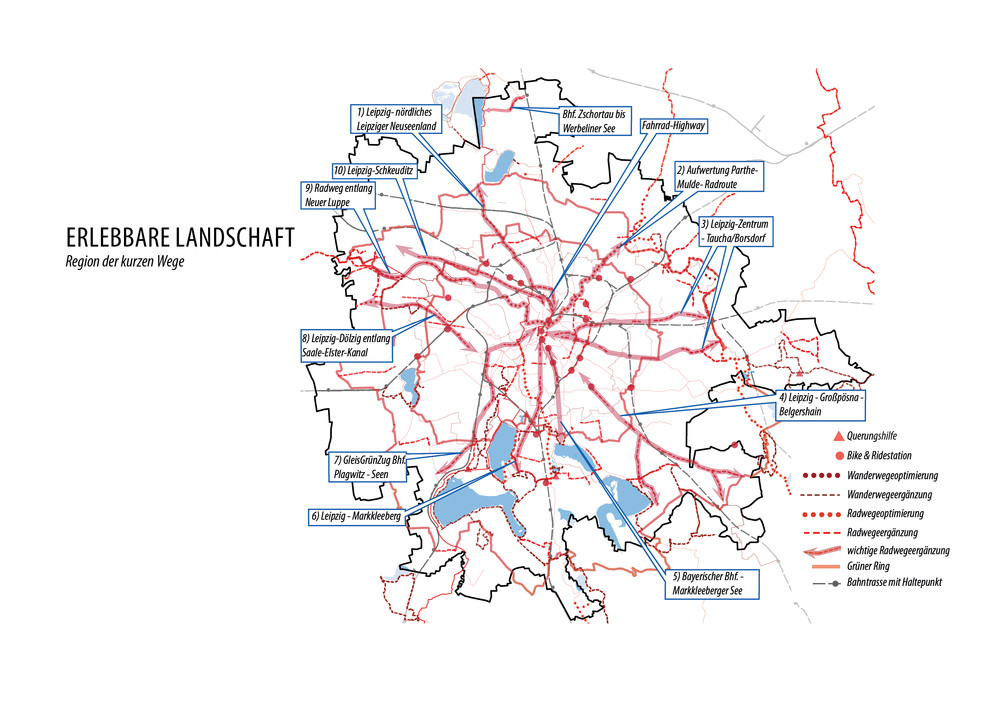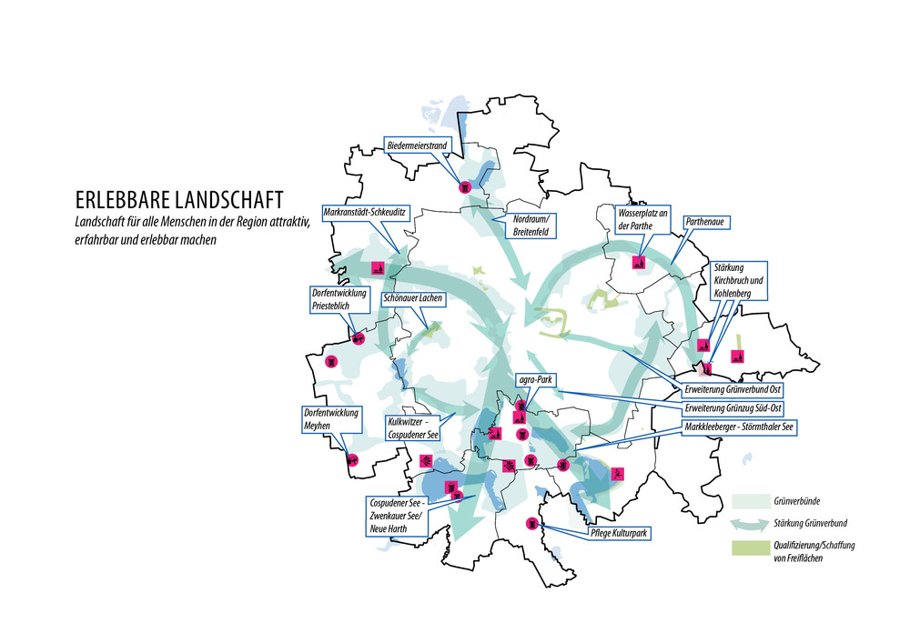 Der Grüne Ring Leipzig ist ein Zusammenschluss von der Stadt Leipzig, 12 Umland-kommunen und zwei Landkreisen um umwelt- und erholungsrelevante Themen der Regionalentwicklung zu diskutieren und Maßnahmen auch über kommunale Grenzen hinweg umsetzen zu können. Der demographische, strukturelle und wirtschaftliche Wandel in der Region des Grünen Ring Leipzig erfordern eine Modifizierung von Zielen und Inhalten des vorhandenen Regionalen Handlungskonzepts. Zukunftsaufgaben wie Klimaanpassung / Risikoprävention, Ressourceneffizienz, Stärkung der Erlebbarkeit von Natur- und Kulturlandschaft oder die Bildung von Stadt-Land-Allianzen zur Direktvermarktung von Lebensmitteln wurden berücksichtigt und spiegeln sich wider in den Handlungsfeldern: starke Landschaft/ stabile Ökosysteme; erlebbare Landschaft; essbare Landschaft; innovative Landschaft. Hierfür wurden Entwicklungsziele und Projektthemen formuliert und in einem partizipativen Prozess etwa 500 Projekte und Maßnahmen zugeordnet. Davon sollen 14 Schlüsselprojekte prioritär umgesetzt werden.