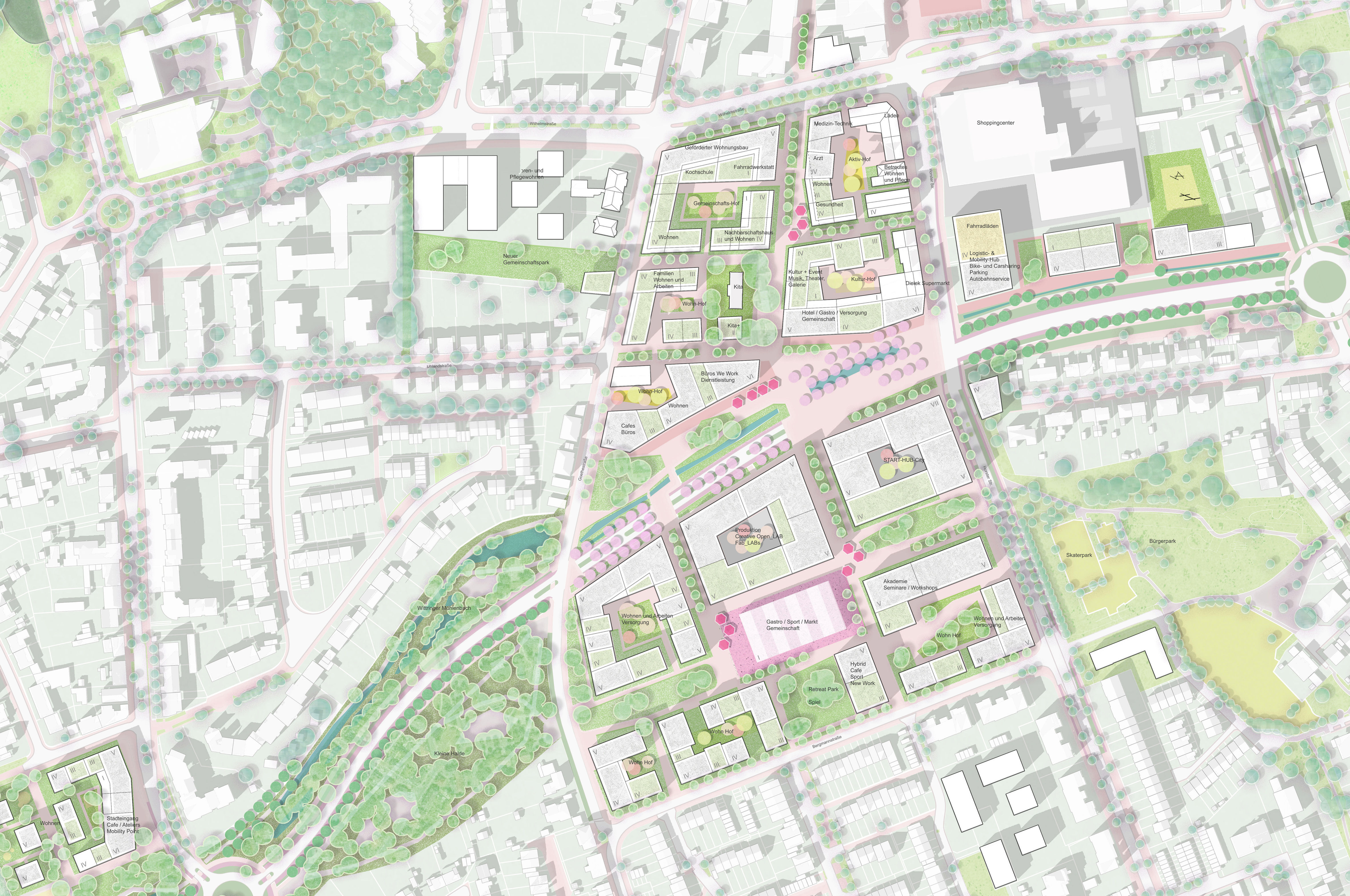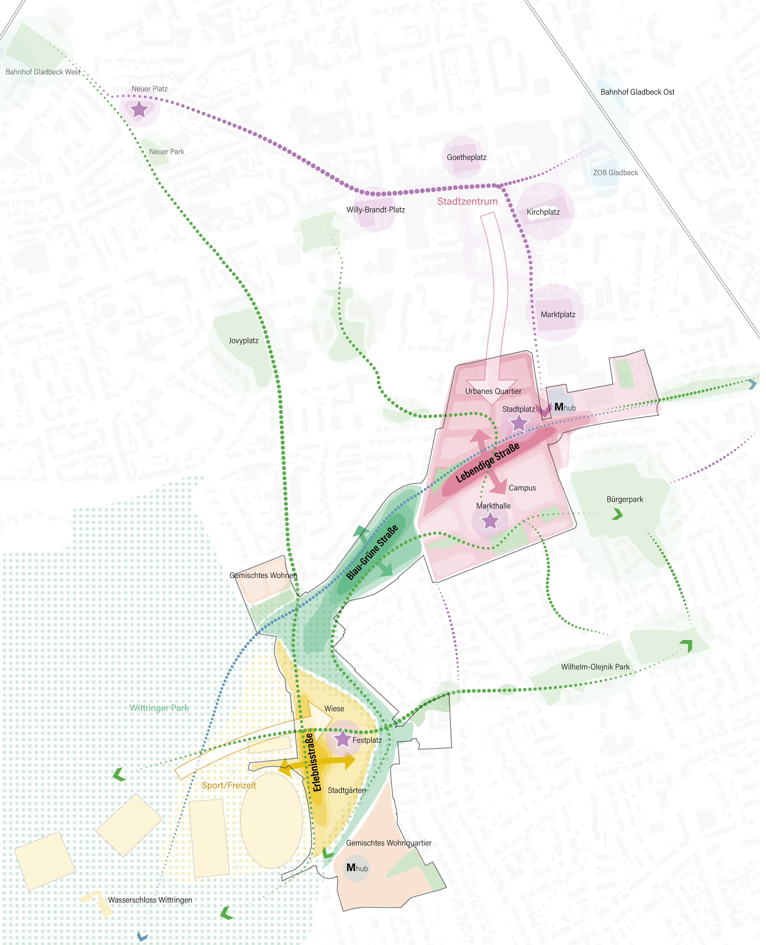 Die Stadt Gladbeck hat das ehrgeizige Ziel durch die Verlegung einer Bundesstraße in einen 1,5 Kilometer langen Tunnel, neue Zukunftsräume für die Zusammenführung der Stadt zu gewinnen. Wir skizzieren in unserem Wettbewerbsbeitrag eine Perspektive der neuen Stadtstraße als Motor der Stadtentwicklung. Nicht die Straße wird 'gesetzt', sondern die Erwartungen an den Stadtraum bestimmen den neuen Mobilitätsraum als ‚lebendige‘, ‚blau-grüne‘ und ‚erlebnisorientierte‘ Infrastruktur. Die Stärkung identitätsstärkender Orte wie einem neuen Verbindungsquartier, einem Sportpark und einer zur Parkanlage umgestalteten Halde geht zusammen mit Klimaanpassungsmaßnahmen, wassersensiblem Städtebau und der Qualifizierung städtischer Nahmobilität. Ziel ist es die Stadt fit für den Klimawandel zu machen und das Regenwassermanagement zur Stärkung der hitzeangepassten, kühlen und durchgrünten Stadt zu nutzen. Auch urbane Siedlungsbereiche profitieren von dieser Strategie. Sie werden durch gute Schnittstellen zur Bebauung, grünen Innenhöfen, eine Raumfolge grüner Plätze und guter Verbindungsräume in die großen, angrenzenden Parklandschaften vielfältiger. Die neu erschlossenen Stadträume werden über ausgebaute und gut eingebundene Radwege untereinander und mit dem angrenzenden Stadtraum verbunden. Das zentrale Stadtquartier verbindet. Die neue Stadtstraße führt durch einen großzügigen Platz der zugleich als Antrittsraum Richtung Stadtmitte und die südlich gelegenen Stadtquartiere erkennbar wird. Gladbeck wächst zusammen - grün, urban, vernetzt!