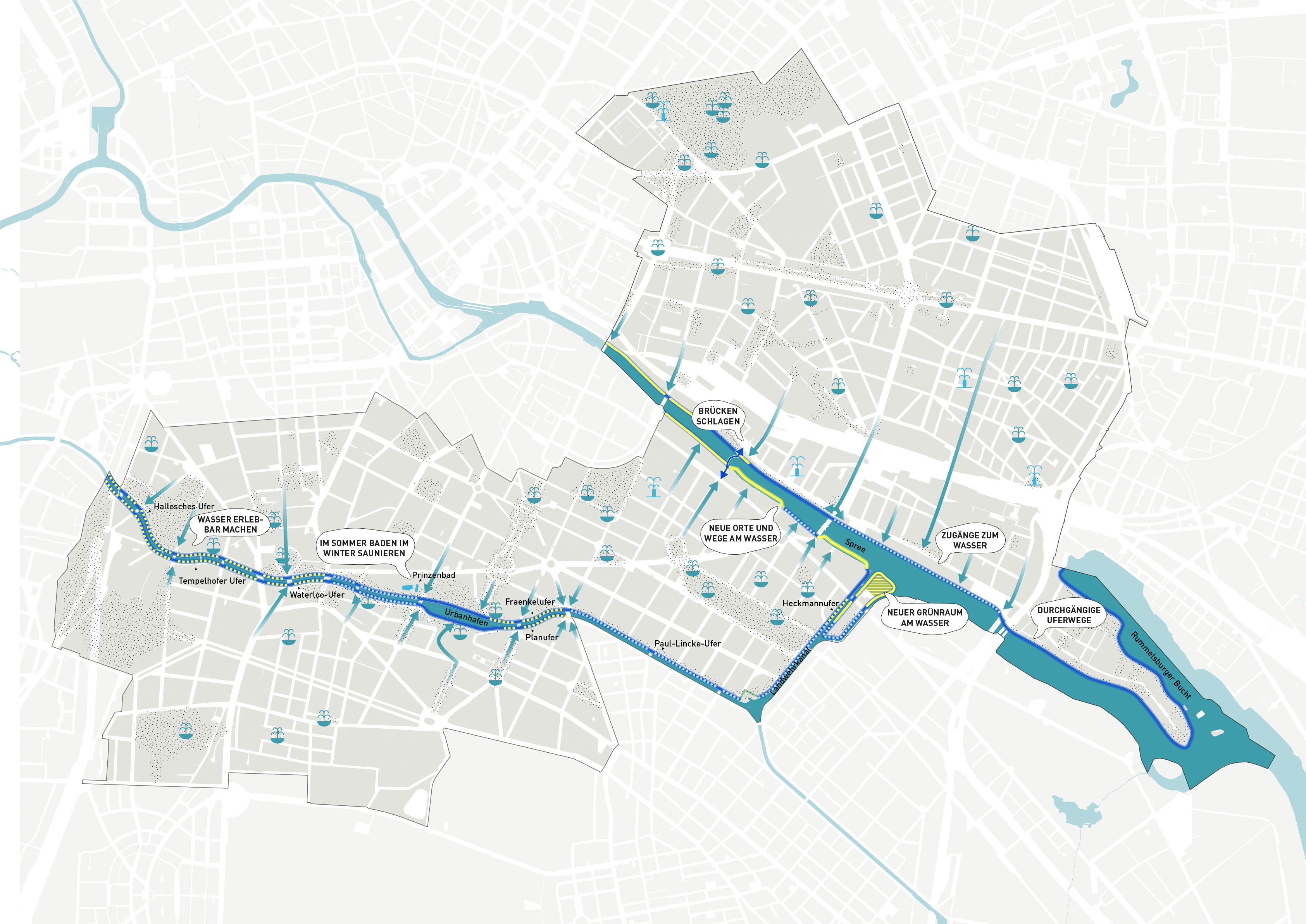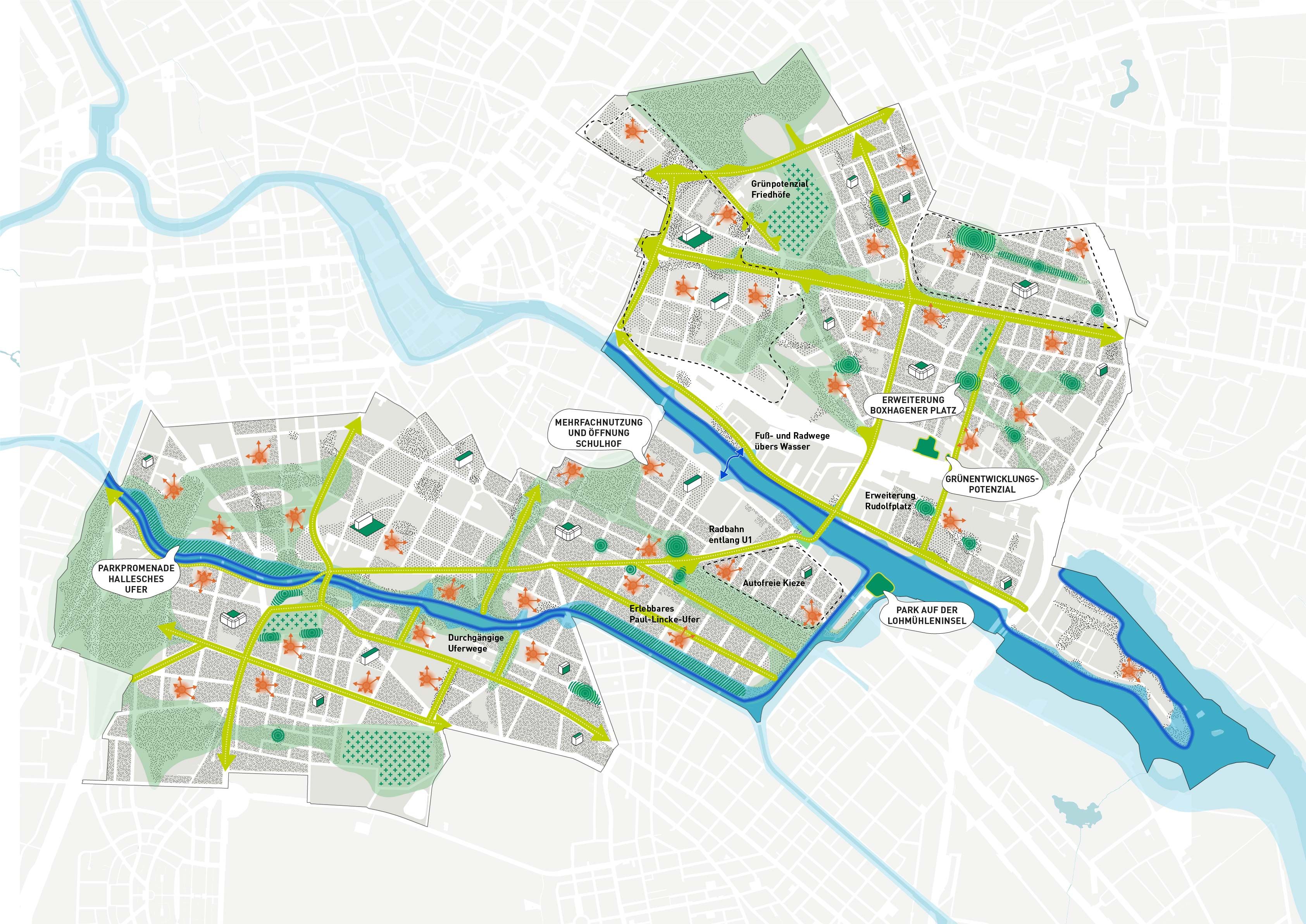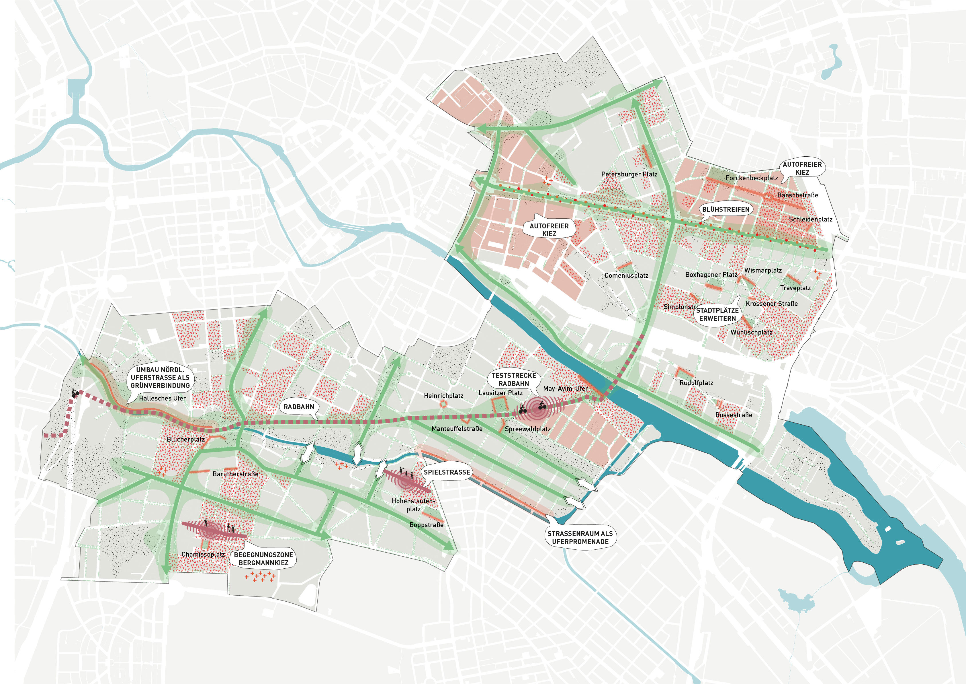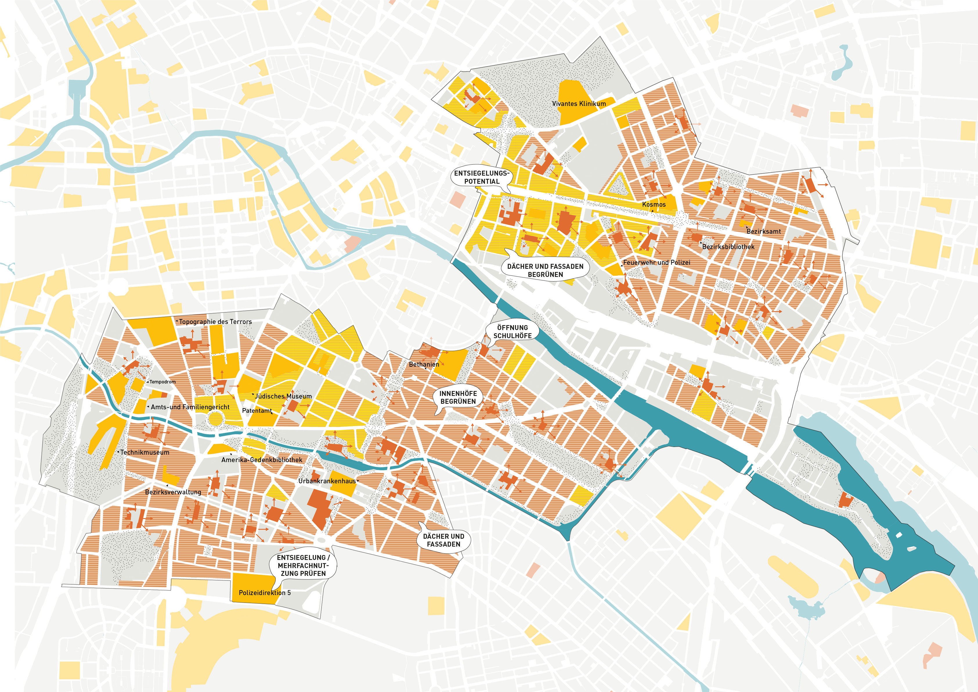 Die vom Bezirk ausgeschriebene Potenzialanalyse ‚Mehr Grün in Friedrichshain-Kreuzberg‘ setzt bei diesem Sachverhalt an. In einem ersten Schritt wurden die Herausforderungen durch die gegenwärtige Stadtentwicklung und Klimakrise im Bezirk herausgearbeitet, um im zweiten Schritt die Potenziale für mehr Grün zu identifizieren. In einem dritten Schritt wurden die Möglichkeiten (Strategien und Instrumente) der Aktivierung und Machbarkeit aufgezeigt. Mit dieser Untersuchung wird ein großes Leitthema der grünen Infrastruktur konkretisiert, das sich auf die Botschaft ‚aus Grau mach Grün‘ fokussiert.