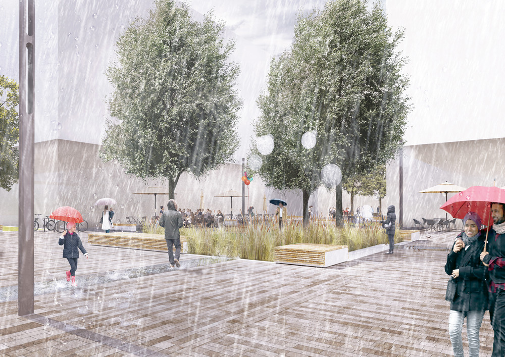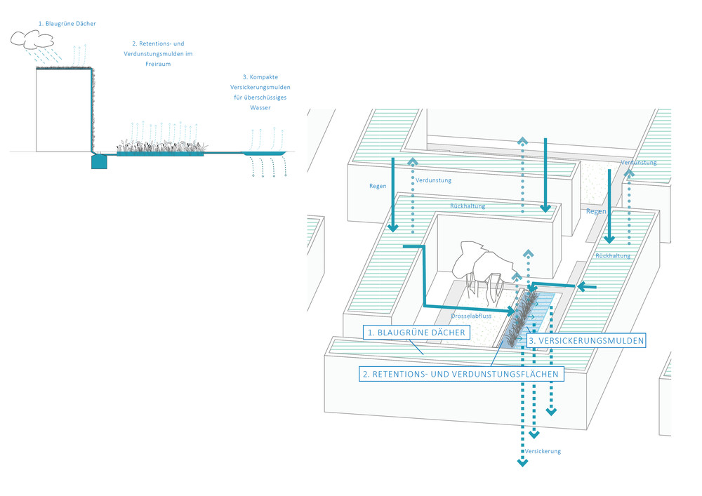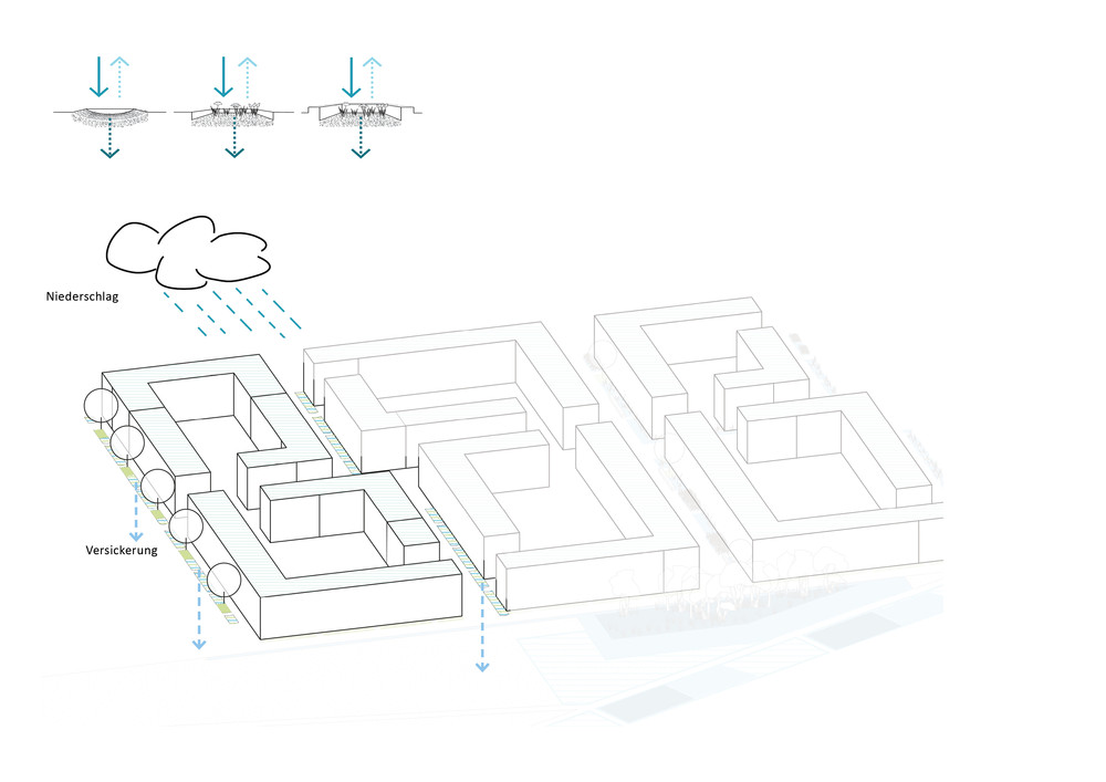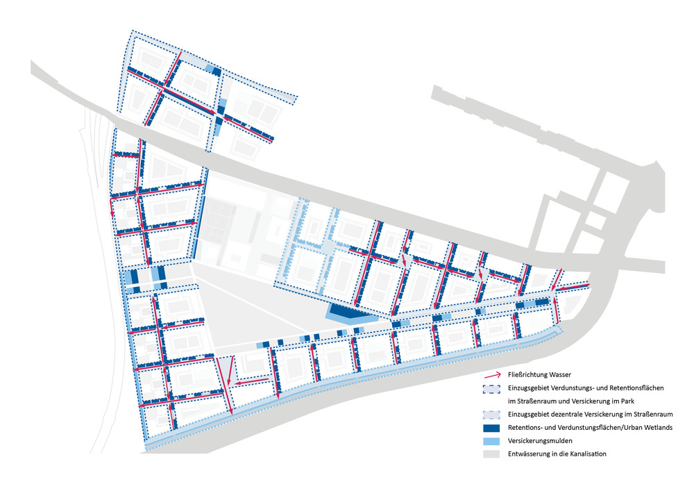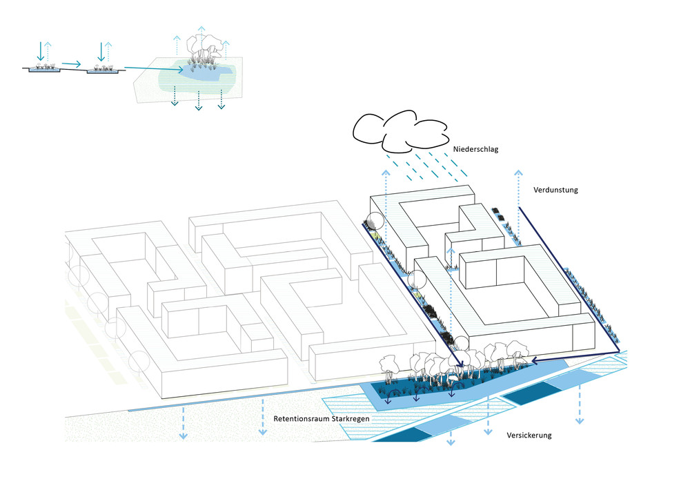 Hier findet das Prinzip der Schwammstadt Anwendung: Das Regenwasser wird als Ressource genutzt, um es durch Speicherung und Verdunstung für die Kühlung des neuen Stadtquartiers einzusetzen. Die Siedlungsentwicklung wird entkoppelt von negativen Wirkungen auf das Klima und den Wasserhaushalt. Das Thema der klimaangepassten Stadt wird als eine Kaskade von Maßnahmen aufgebaut: Rückhalten, Nutzen, Verdunsten und Grundwasser anreichern. Mit dieser Kaskade soll eine Wasserbilanz erreicht werden, die sich den natürlichen Verhältnissen annähert. Ein Großteil des Wassers soll verdunsten, ein kleiner Teil versickern. Kein Wasser soll oberflächlich abfließen. Für die Baufelder und die öffentlichen Räume werden dazu unterschiedliche Strategien entwickelt. Die graue Infrastruktur wird hier zur grau-grünen Infrastruktur. Neben dem veränderten Umgang mit dem Regenwasser werden weitere Bausteine für die Hitzeanpassung wie Schatten, Albedo sowie Wohlfühlräume vorgeschlagen. bgmr Landschaftsarchitekten erarbeiteten den Regenwasserleitplan und setzen die Konzeption derzeit für den Bereich der öffentlichen Quartierstraßen und Plätze entwurflich um.