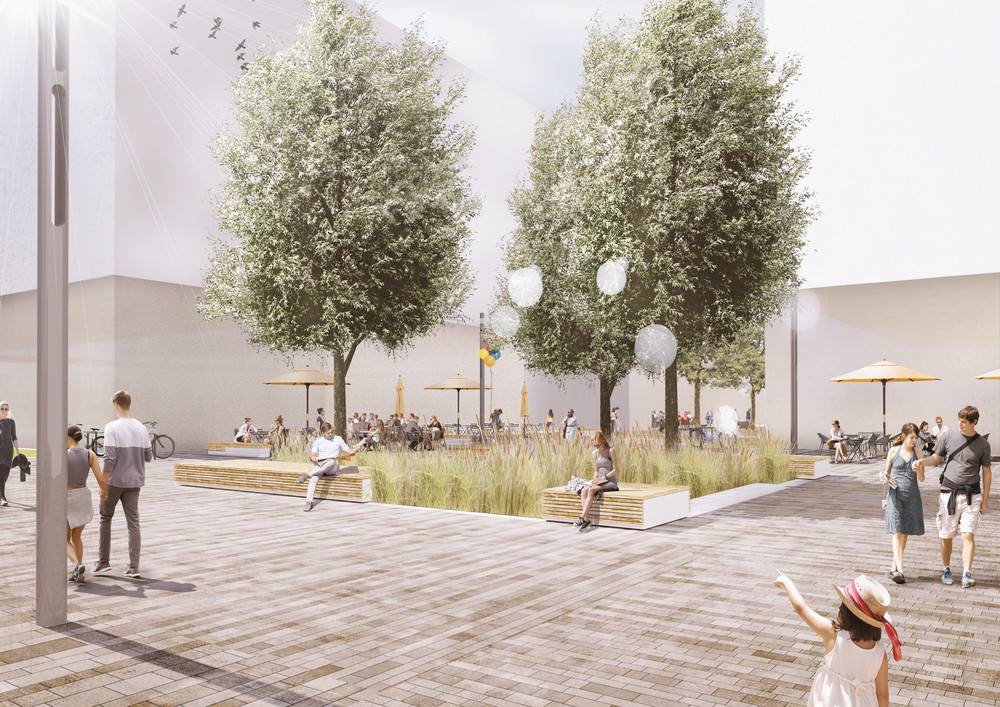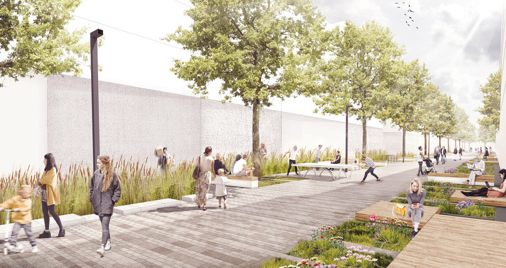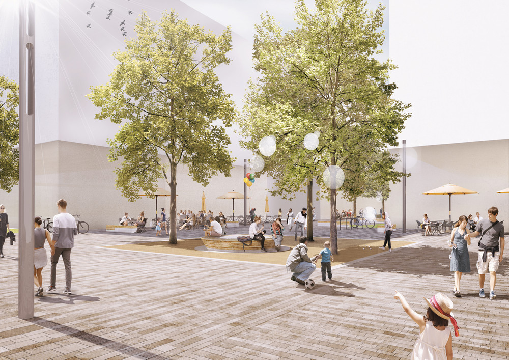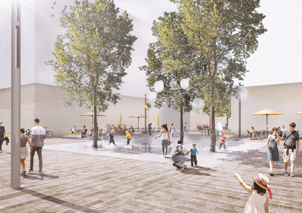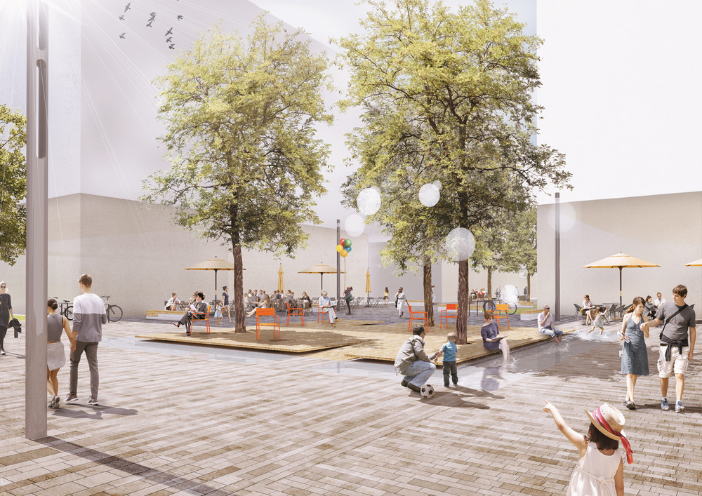 Hier findet das Prinzip der Schwammstadt Anwendung: Das Regenwasser wird als Ressource genutzt, um es durch Speicherung und Verdunstung für die Kühlung des neuen Stadtquartiers einzusetzen. Die Siedlungsentwicklung wird entkoppelt von negativen Wirkungen auf das Klima und den Wasserhaushalt. Das Thema der klimaangepassten Stadt wird als eine Kaskade von Maßnahmen aufgebaut: Rückhalten, Nutzen, Verdunsten und Grundwasser anreichern. Mit dieser Kaskade soll eine Wasserbilanz erreicht werden, die sich den natürlichen Verhältnissen annähert. Ein Großteil des Wassers soll verdunsten, ein kleiner Teil versickern. Kein Wasser soll oberflächlich abfließen. Für die Baufelder und die öffentlichen Räume werden dazu unterschiedliche Strategien entwickelt. Die graue Infrastruktur wird hier zur grau-grünen Infrastruktur. Neben dem veränderten Umgang mit dem Regenwasser werden weitere Bausteine für die Hitzeanpassung wie Schatten, Albedo sowie Wohlfühlräume vorgeschlagen. bgmr Landschaftsarchitekten erarbeiteten den Regenwasserleitplan und setzen die Konzeption derzeit für den Bereich der öffentlichen Quartierstraßen und Plätze entwurflich um.