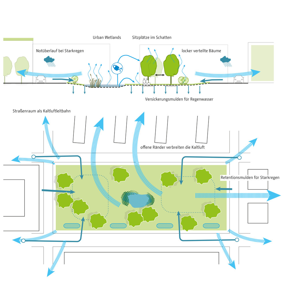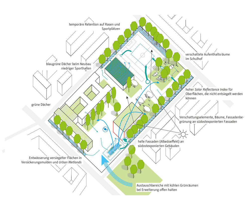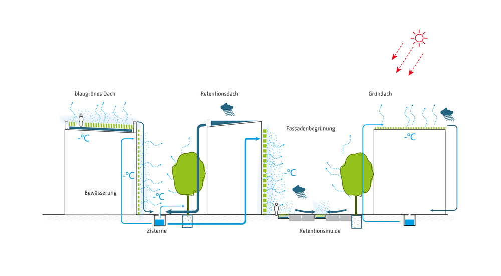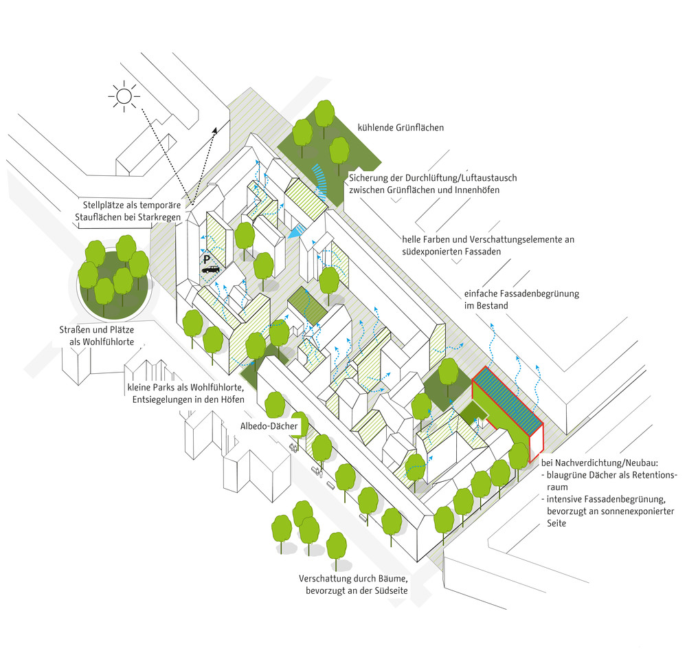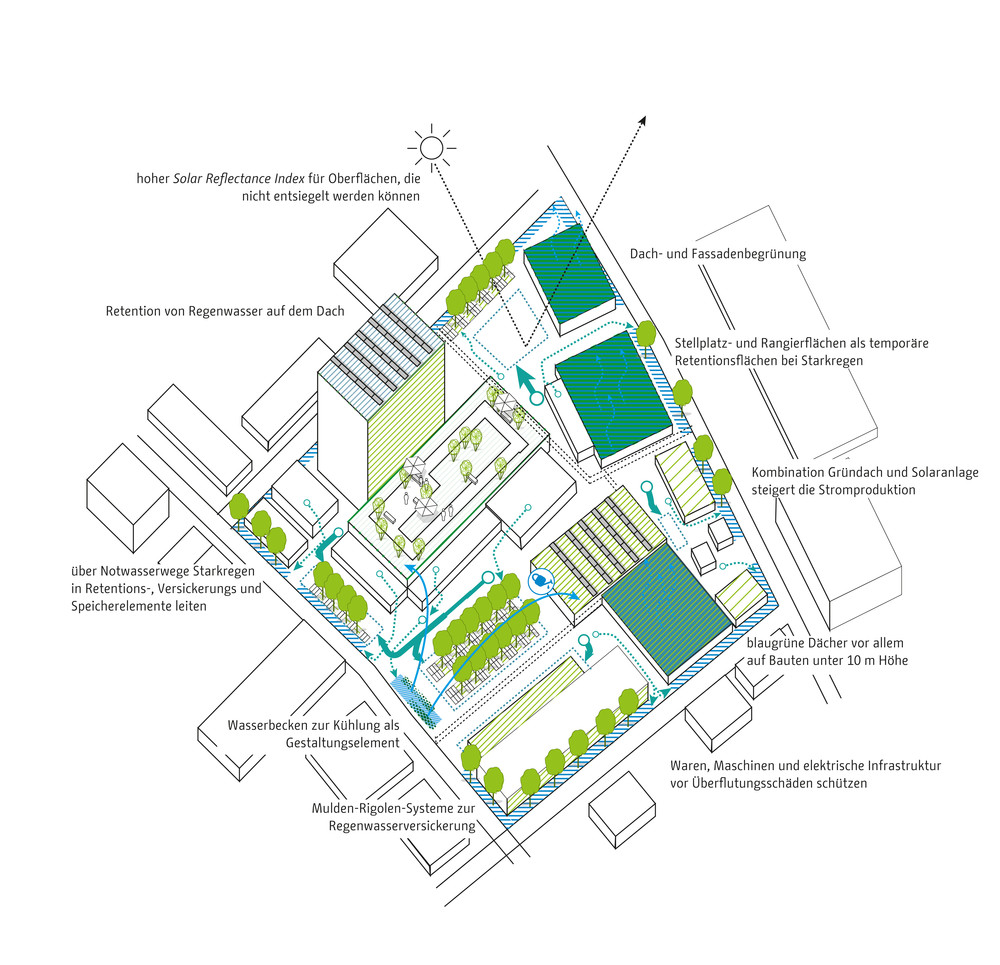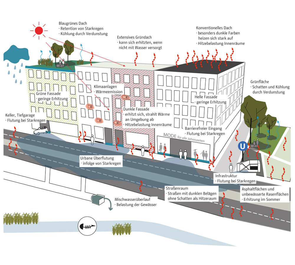 Die zentrale Herausforderung des Klimaanpassungskonzepts ist die Frage, wie Berlin sich als wachsende Stadt weiter entwickeln kann und gleichzeitig negative Wirkungen des Klimawandels in der Stadt vermieden werden können. Die Handlungsfelder sind die hitzeangepasste Stadt und die wassersensible Stadtentwicklung. Zur Optimierung von Klimaanpassungsmaßnahmen werden konkrete Lösungsansätze beispielsweise für Dächer, Fassaden, Verschattung, Albedo und Solar Reflectance Index, Retentionsmaßnahmen und Urbane Kühlelemente dargestellt. Diese Maßnahmen werden in typologisch unterschiedlichen Handlungsräumen exemplarisch verortet, wie beispielsweise in Gewerbe und Industriegebieten, bei der Nachverdichtung in der Zeilenbebauung, beim Geschosswohnungsneubau oder auch in Straßen und Plätzen sowie Grün- und Freiflächen. Strategien zur Verankerung der Klimaanpassung in der Stadtentwicklung Berlins zeigen die aktuellen Projekte des Aktionsplans.