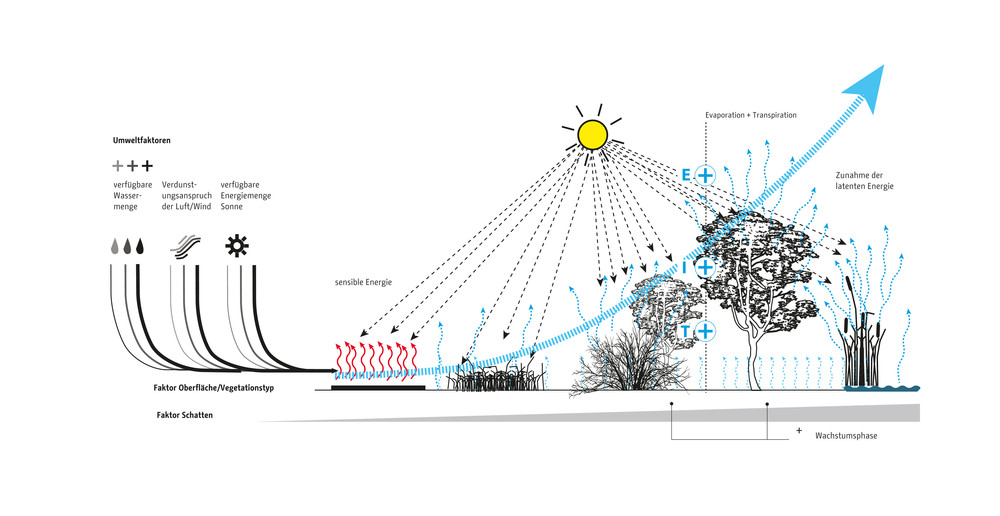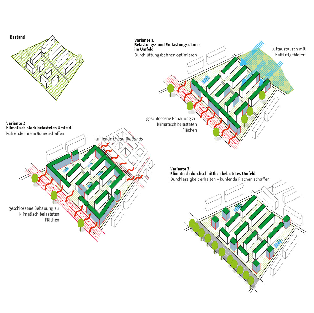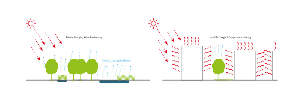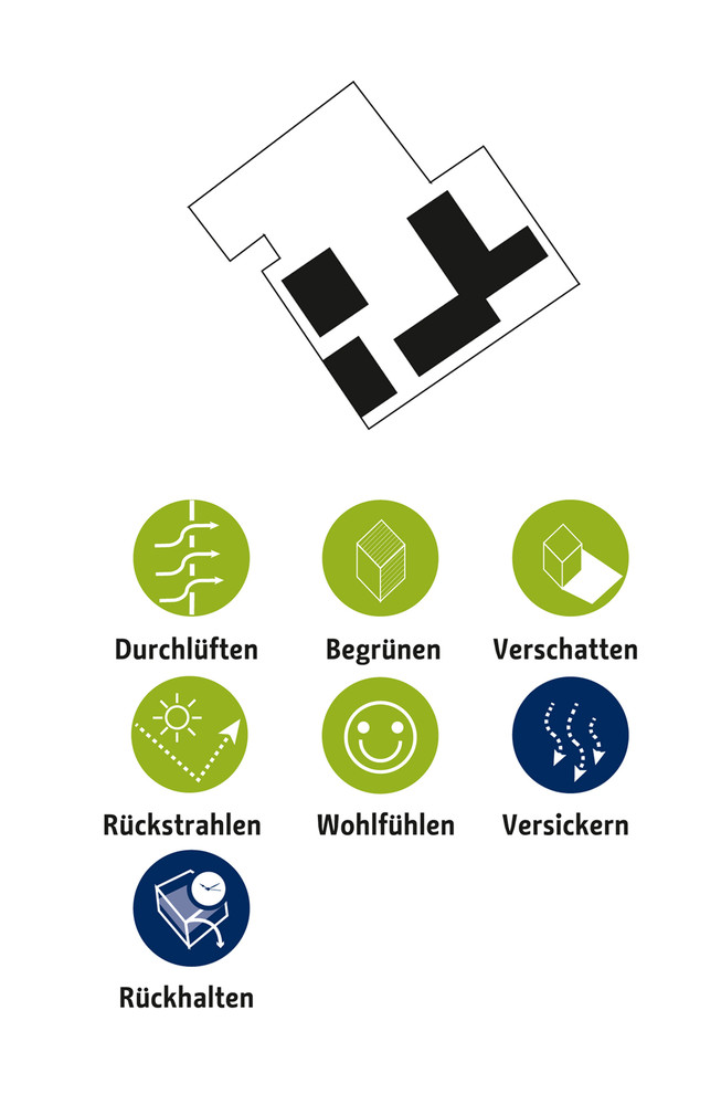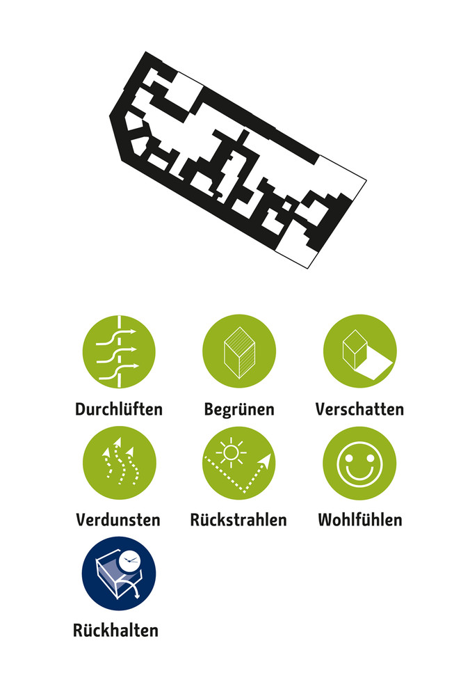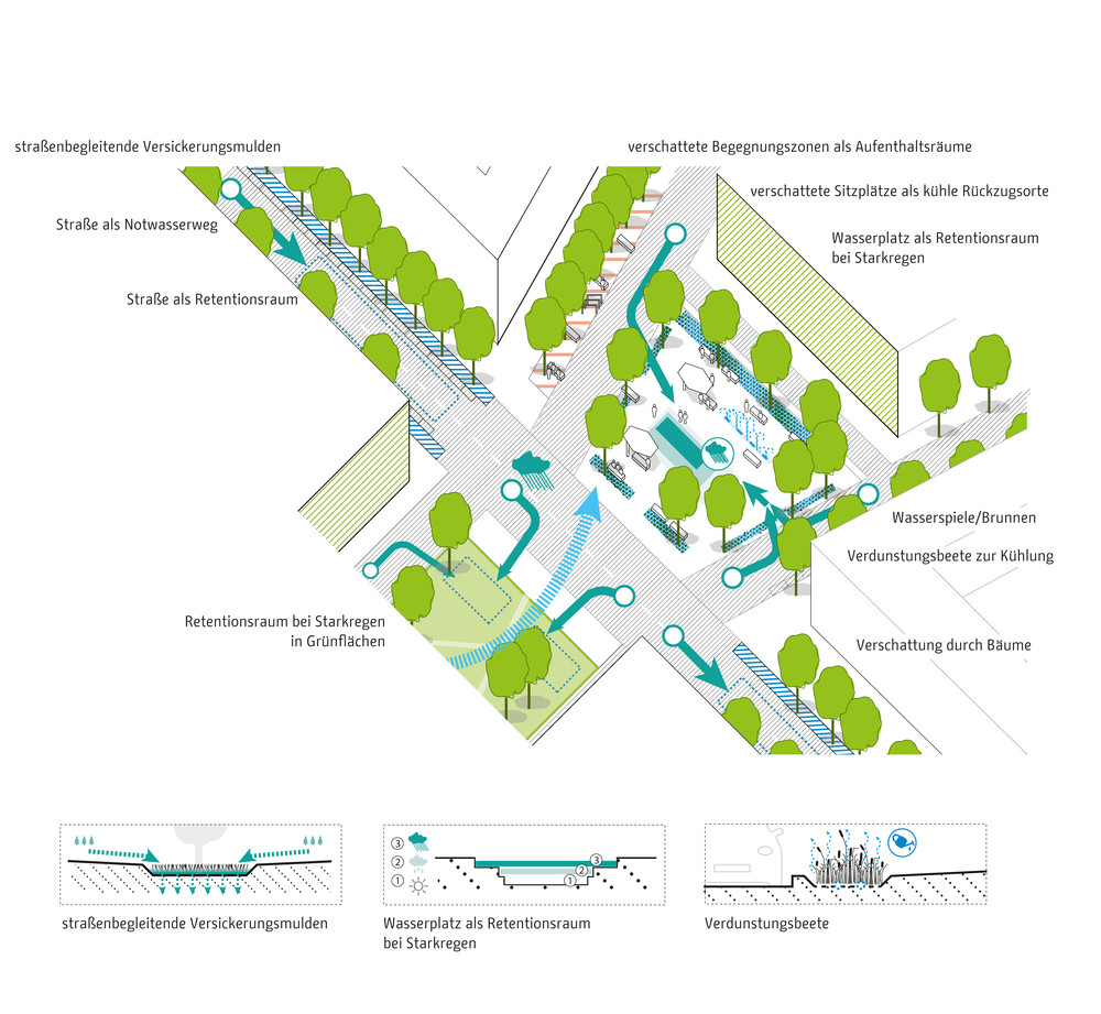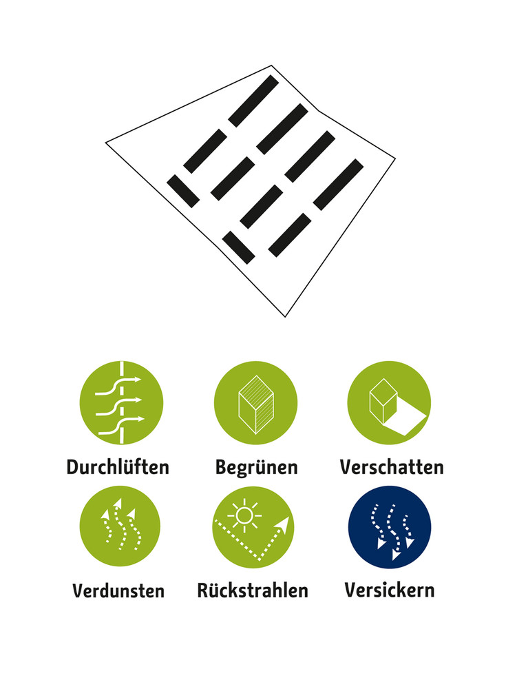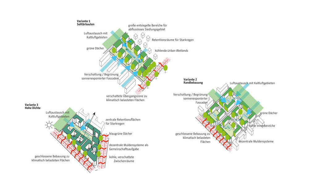 Die zentrale Herausforderung des Klimaanpassungskonzepts ist die Frage, wie Berlin sich als wachsende Stadt weiter entwickeln kann und gleichzeitig negative Wirkungen des Klimawandels in der Stadt vermieden werden können. Die Handlungsfelder sind die hitzeangepasste Stadt und die wassersensible Stadtentwicklung. Zur Optimierung von Klimaanpassungsmaßnahmen werden konkrete Lösungsansätze beispielsweise für Dächer, Fassaden, Verschattung, Albedo und Solar Reflectance Index, Retentionsmaßnahmen und Urbane Kühlelemente dargestellt. Diese Maßnahmen werden in typologisch unterschiedlichen Handlungsräumen exemplarisch verortet, wie beispielsweise in Gewerbe und Industriegebieten, bei der Nachverdichtung in der Zeilenbebauung, beim Geschosswohnungsneubau oder auch in Straßen und Plätzen sowie Grün- und Freiflächen. Strategien zur Verankerung der Klimaanpassung in der Stadtentwicklung Berlins zeigen die aktuellen Projekte des Aktionsplans.
