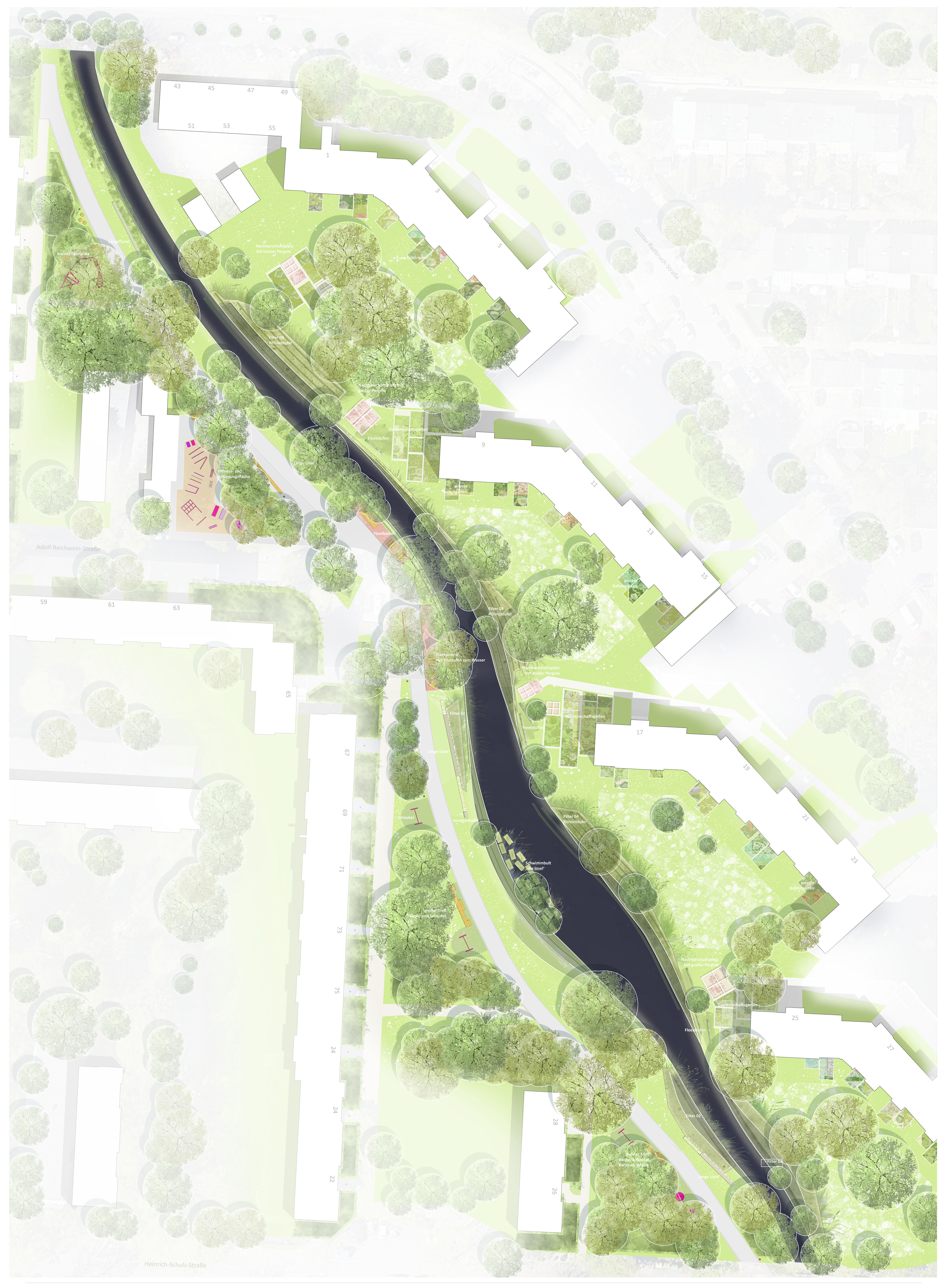 Das Projekt ‚Neue Vahr grün-blau‘ ging als Pilotvorhaben aus der Masterplanung ‚Neue Vahr 2035‘ hervor. In der Folge des vorausgegangenen Leitbildprozesses, erarbeitete bgmr mit der Stadt Bremen, der Gewoba Wohungsbaugesellschaft und dem Bremischen Deichverband, im engen Dialog mit den Anwohnenden der Neuen Vahr, Lösungen für die Aufwertung der Freianlagen im Projektraum einer Pilotfläche. Der ausgewählte Referenzraum beinhaltet eine Wasserlage (Achterkampsfleet), eine öffentliche Parkanlage mit Schnittstellen zum öffentlichen Straßenland sowie Freiflächen im privaten Wohnumfeld. Zielstellung war die Erprobung von guten Lösungen mit hoher Übertragbarkeit auf andere, vergleichbare Lagen in der ‚Neuen Vahr‘.