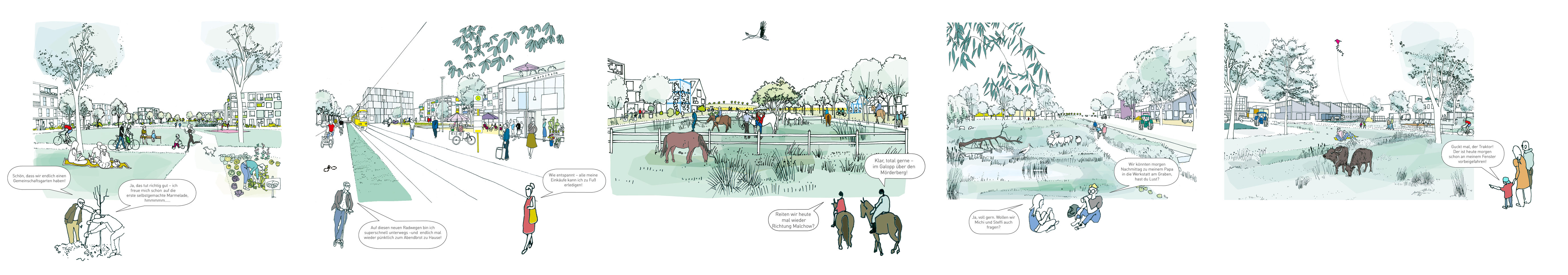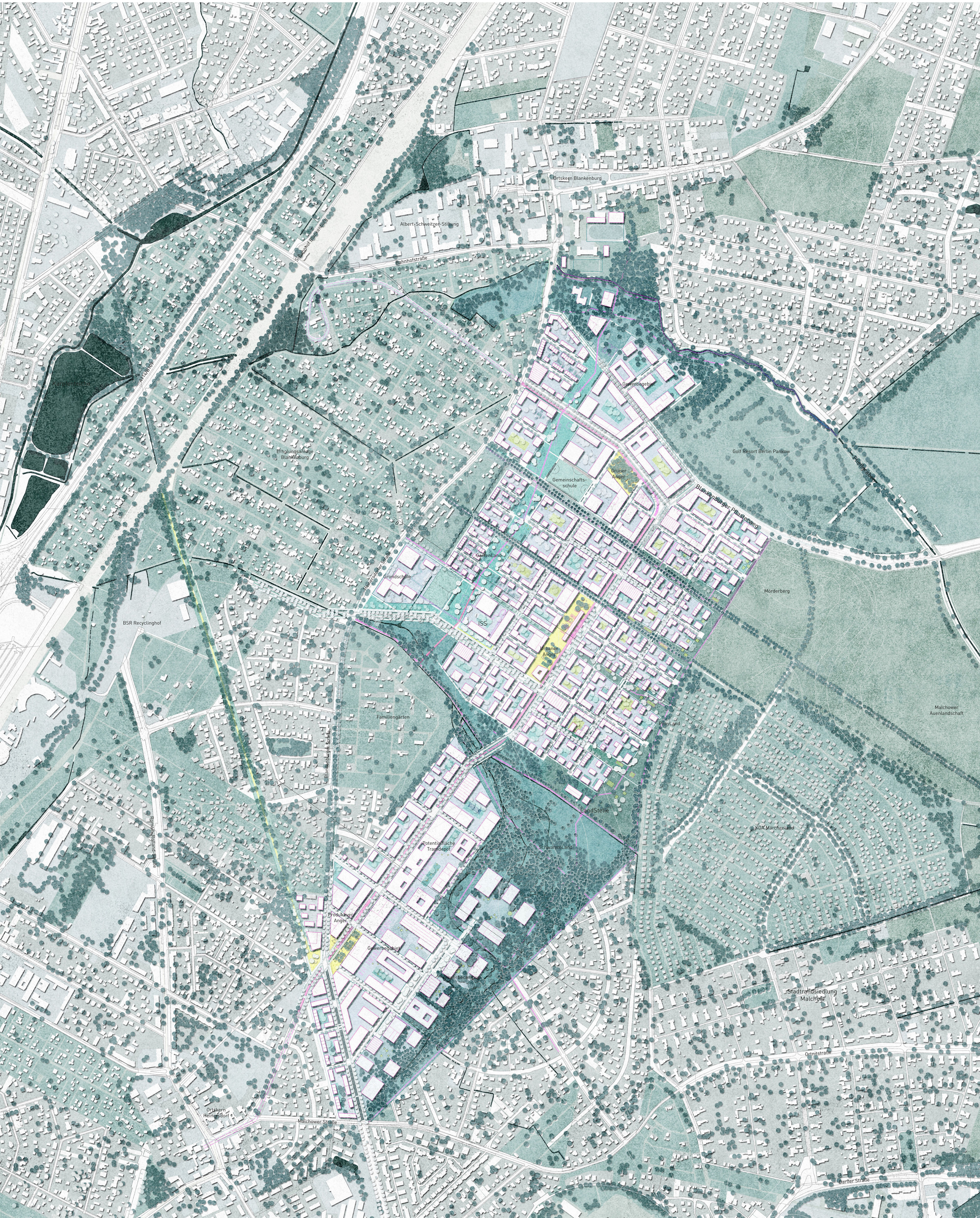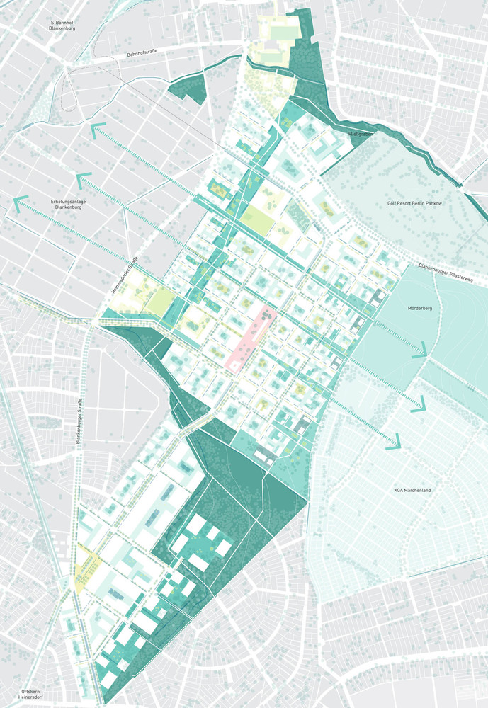 Im Berliner Bezirk Pankow, zwischen Blankenburg und Heinersdorf – im so genannten Blankenburger Süden – soll ein neues Stadtquartier mit 5000-6000 Wohneinheiten entstehen. Unser Beitrag arbeitet die örtlichen Potenziale als Anknüpfungspunkte für das neue Stadtquartier heraus. Durch die Lage am kulturlandschaftlich geprägten Stadtrand besteht die Chance auf ein Leben mit der Landschaft in guter Nachbarschaft zu den bestehenden Quartieren. Der Landschaftsraum und die historischen, dörflichen Kerne werden als Orientierungen für die Profilierung des Standorts wiederentdeckt. Der neue Stadtteil kommuniziert über drei Teilquartiere und drei Landschaften mit den bestehenden Nachbarschaften. Das im Schwerpunkt gewerbliche Quartier am Schmöckpfuhlgraben, die neuen Wohnlagen auf den ehemaligen Rieselfeldern und das mischgenutzte Teilquartier am Blankenburger Pflasterweg verbinden sich über das GartenLand, das PonyLand und das SchwammLand mit ihrer Umgebung. Neben der Einordnung öffentlicher Versorgungseinrichtungen und der verkehrlichen Anbindung formuliert der Beitrag eine langfristige Perspektive für die klimasensible Integration neuer Baulandflächen am Stadtrand Berlins.