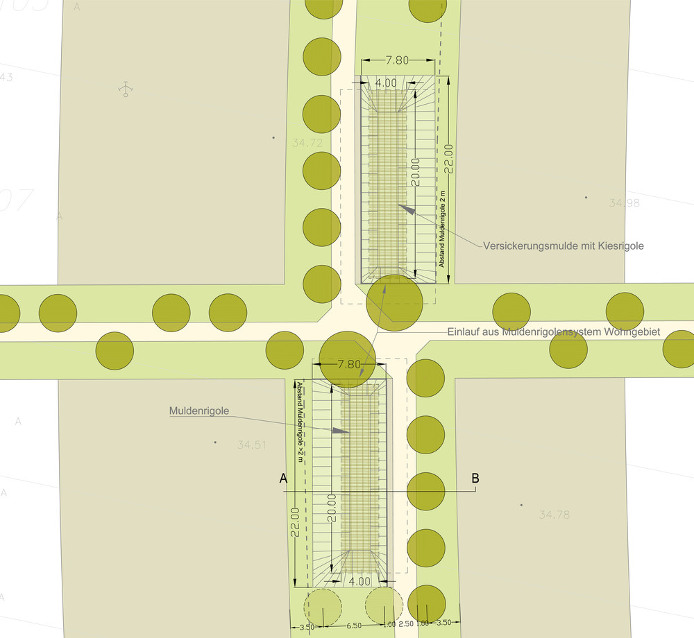 In einem Regenwasserkonzept wurde ein Mulden-Rigolensystem mit gestalterisch in öffentlichen Grünflächen integrierten semizentralen Versickerungsflächen entwickelt. Hierdurch kann das gesamte Niederschlagswasser im Plangebiet des B-Plans Nr. 129 zurückgehalten werden.