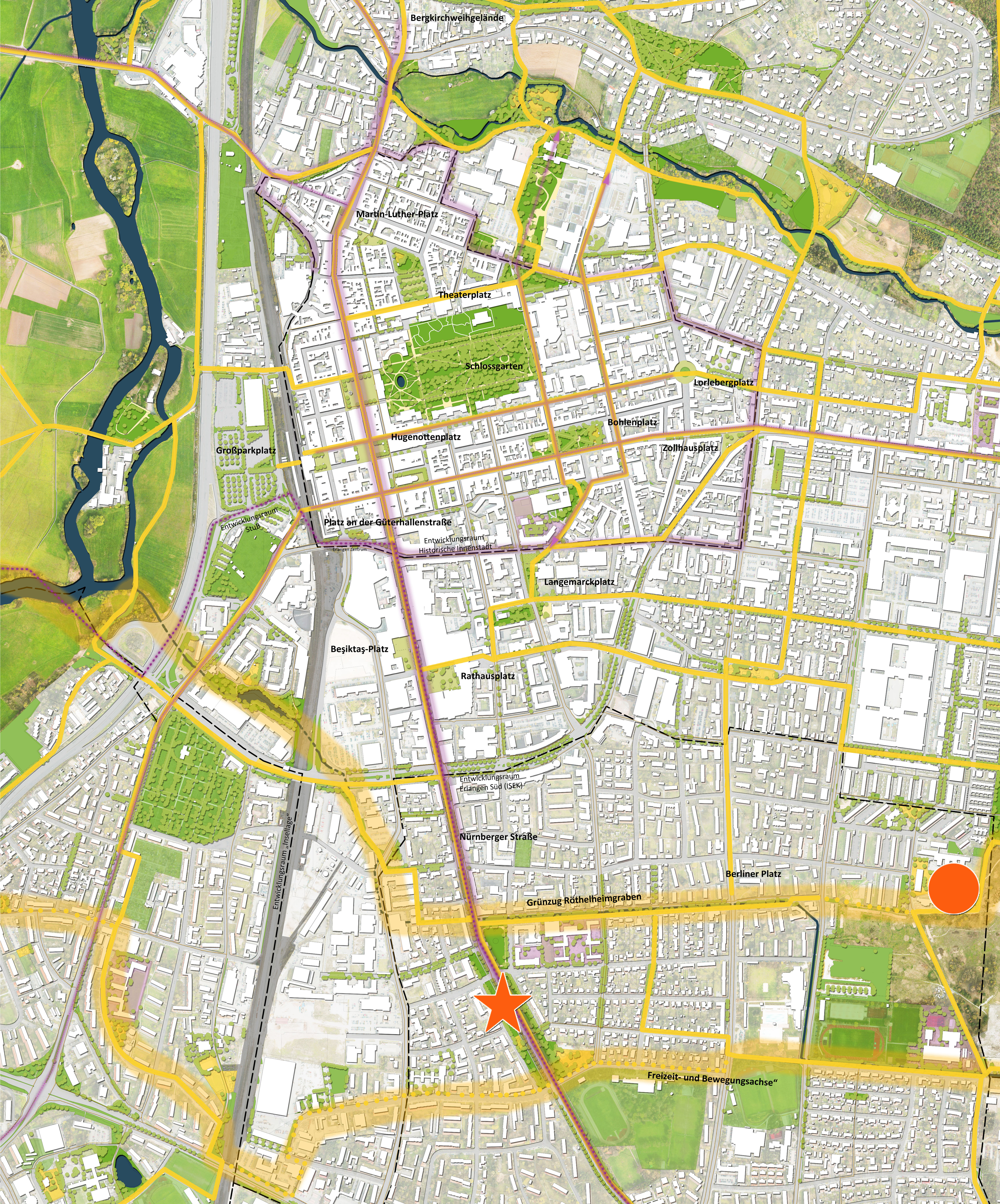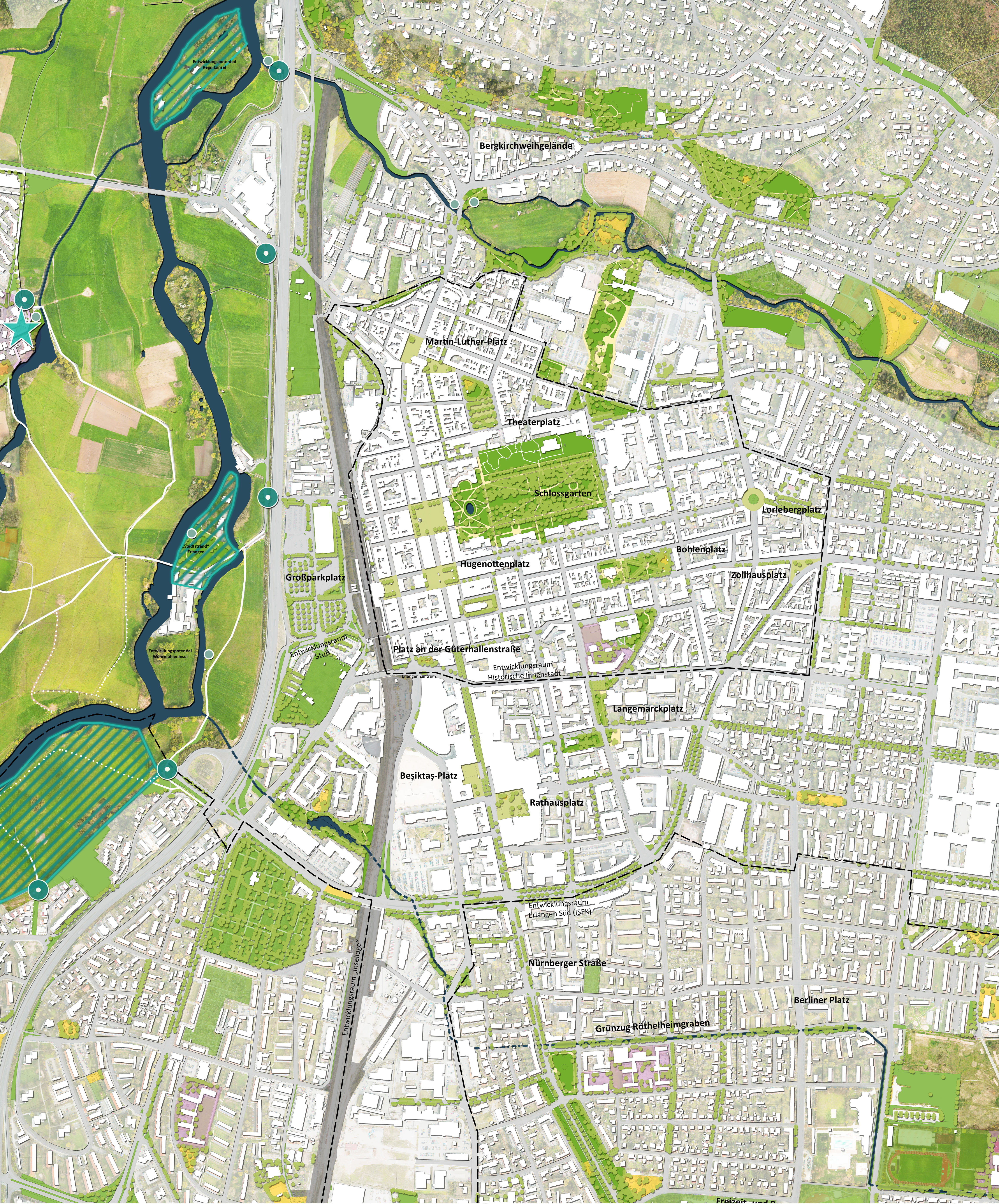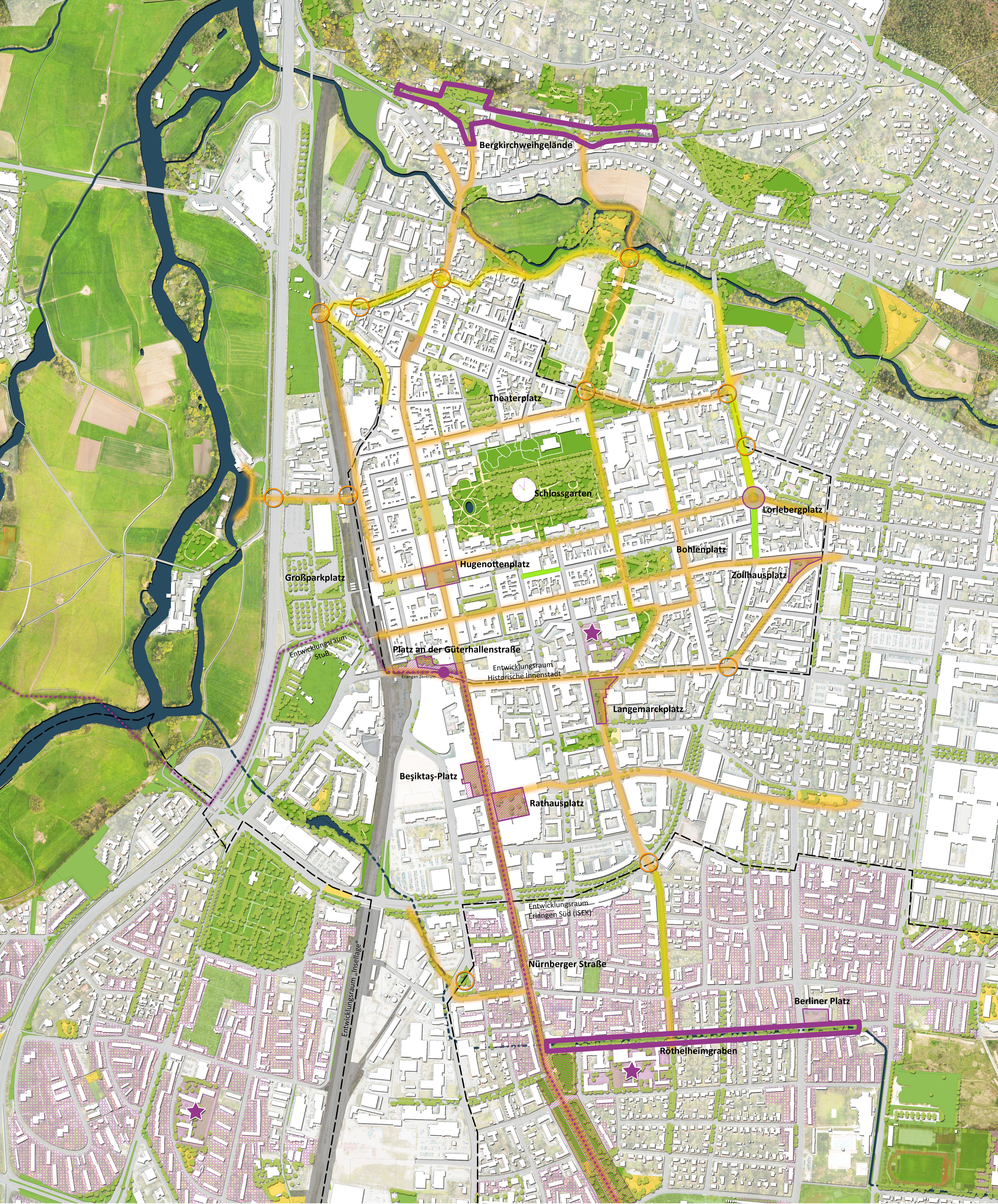 Für die Grünentwicklung in Erlangen wurden drei räumliche Handlungsschwerpunkte herausgestellt. Diesen Handlungsschwerpunkten wurden übergeordnete Leitziele zugeordnet, für die konkrete Maßnahmen abgeleitet wurden.