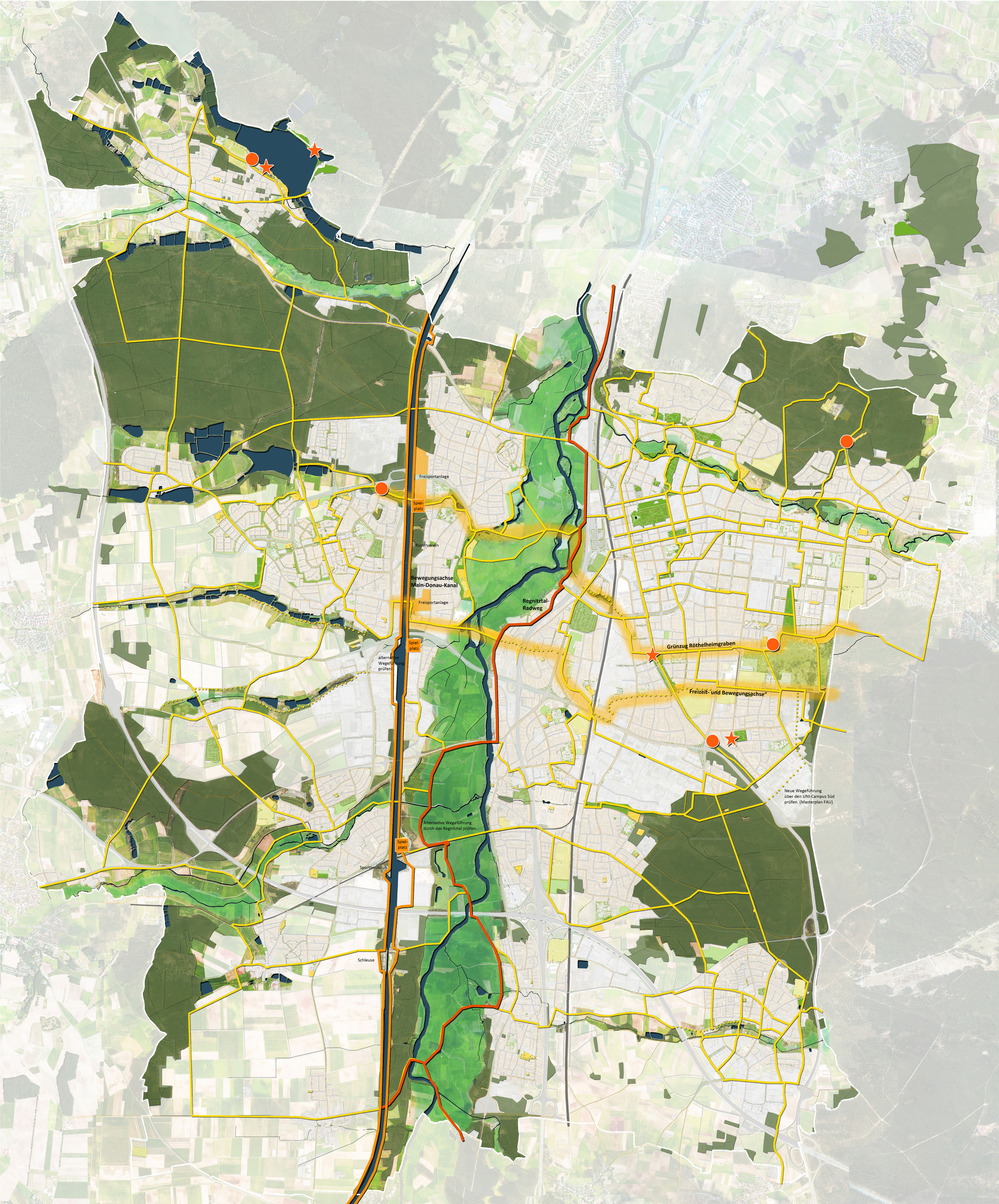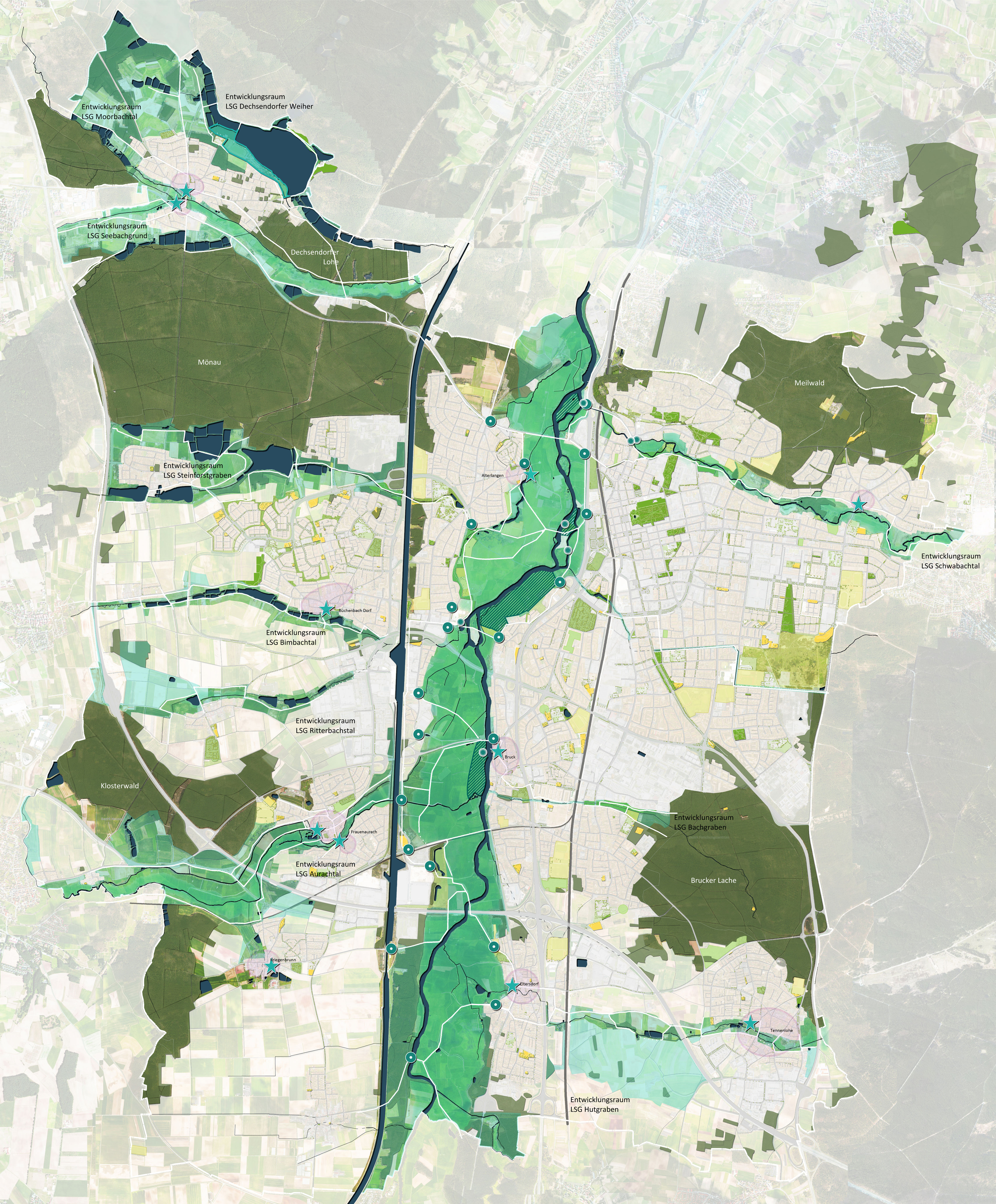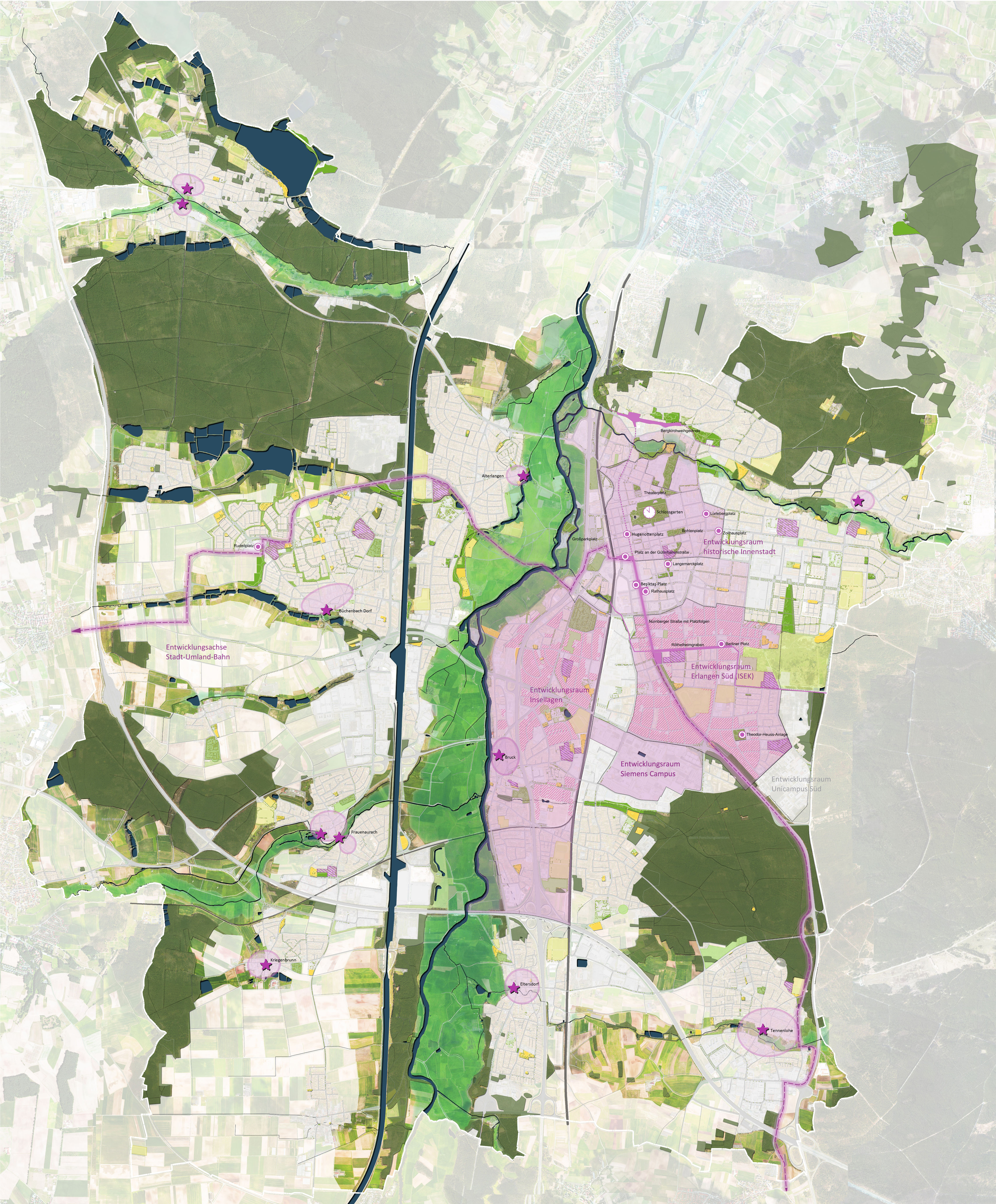 Für die Grünentwicklung in Erlangen wurden drei räumliche Handlungsschwerpunkte herausgestellt. Diesen Handlungsschwerpunkten wurden übergeordnete Leitziele zugeordnet, für die konkrete Maßnahmen abgeleitet wurden.