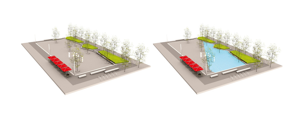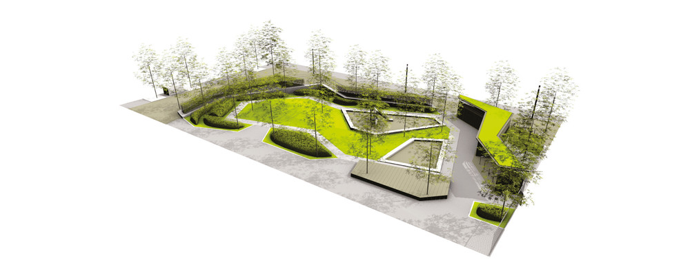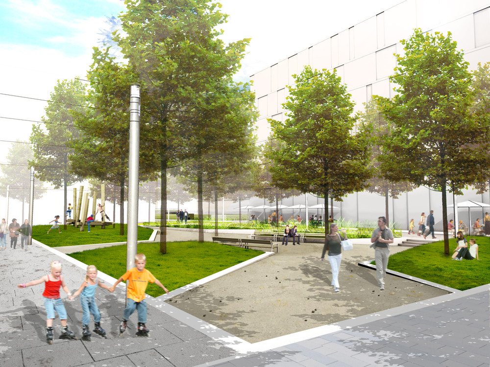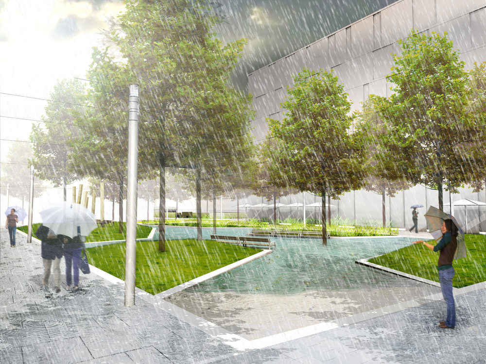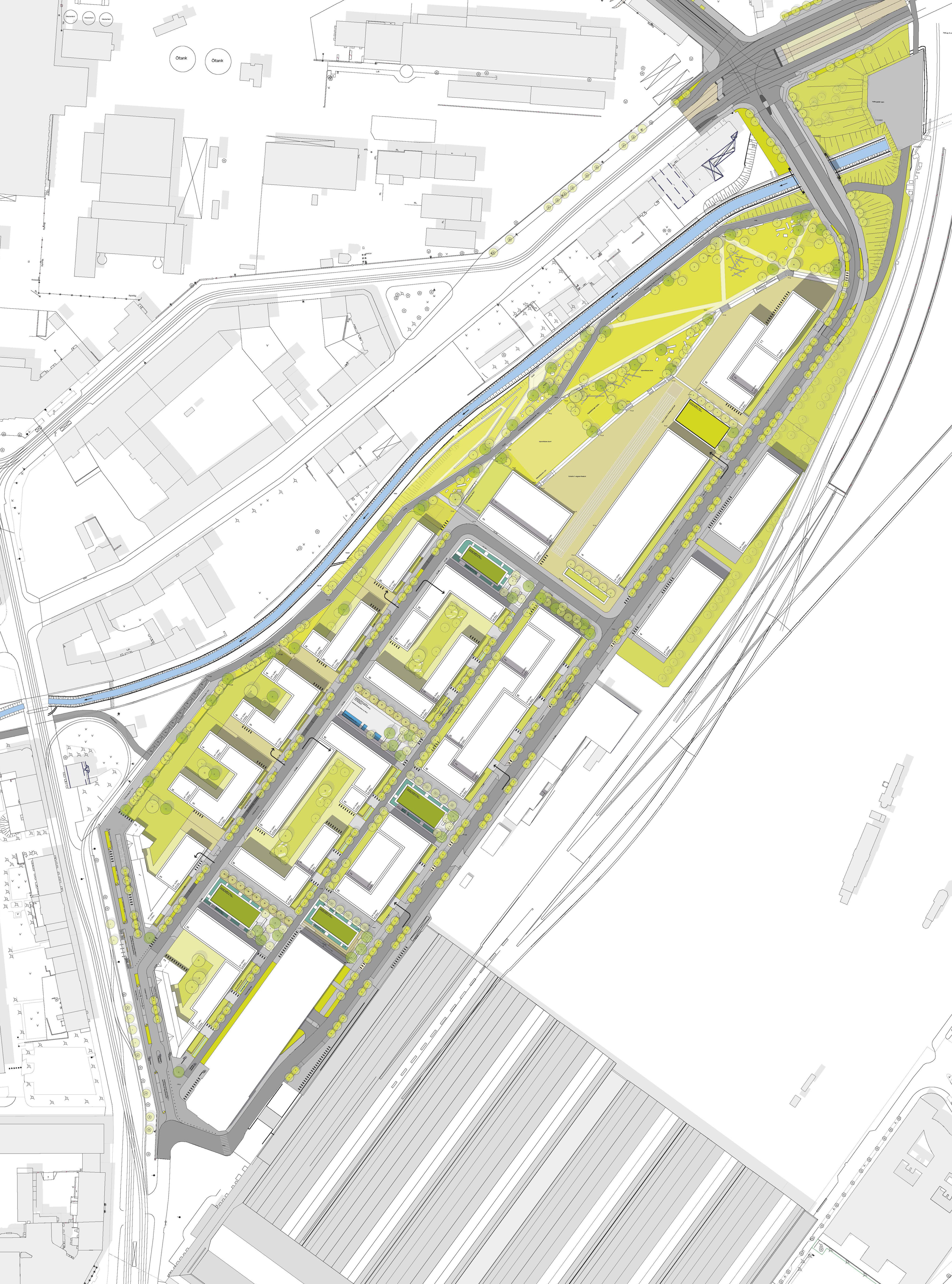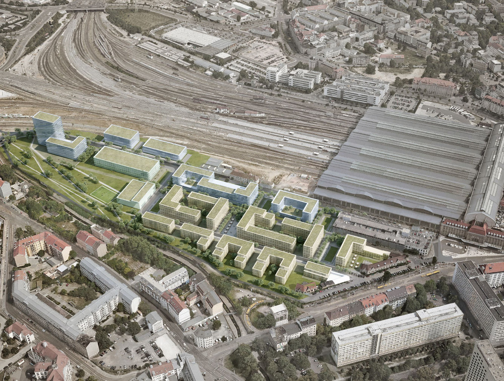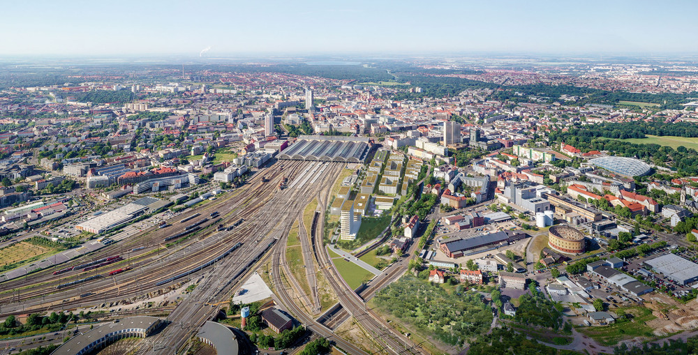 In unmittelbarer Nähe zum Hauptbahnhof der Stadt Leipzig wird eine 11 ha große Bahnbrache als gemischtes Stadtquartier mit Dienstleistungen, Freizeitangeboten, Science-Center, Einrichtungsmeile und Wohnnutzungen entwickelt. Ein einfaches, modular umsetzbares Erschließungsgerüst stellt die Grundlage der Entwicklung dar. Mit kleineren zentralen Stadtplätzen werden neue Lagequalitäten und Anker der modularen Entwicklung gesetzt. Auf der Suche nach Identitäten für das neue Stadtquartier wird der Flussraum der Parthe mit seinen grünen Begleiträumen zur besonderen Parklage aufgewertet. Die Stadtplätze wurden zur Aufnahme von Starkregenereignissen als temporäre, städtische Überflutungsbereiche konzipiert. Sie übernehmen Pufferfunktion für die angrenzende Flusslage und werden gleichzeitig temporär zum besonderen, wassersensiblen Erlebnisbereich in der Stadt.