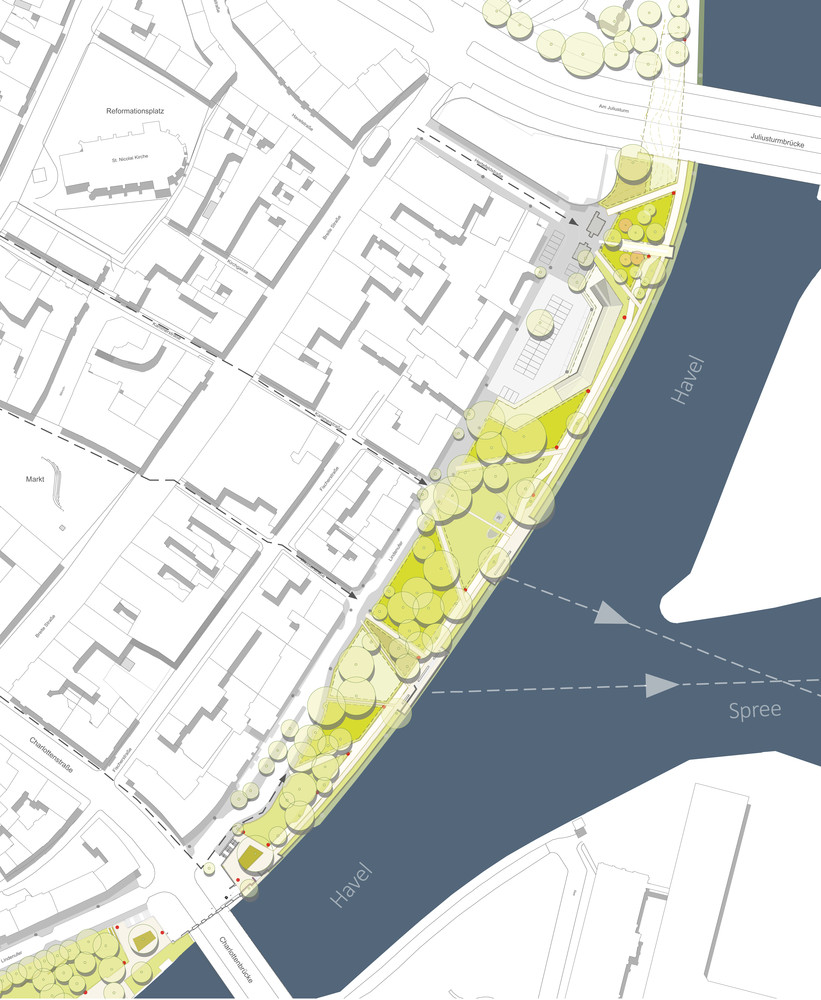 Das Entwicklungskonzept für das neue Lindenufer ist das Ergebnis einer intensiven öffentlichen Diskussion um die Weiterentwicklung des östlichen Altstadtufers Spandaus. Die Erschließung der Parkanlage wurde neu geordnet und auf die angrenzenden Altstadtstraßen ausgerichtet. Zudem wurde eine Stellplatzanlage und der übergeordnete Havelradweg integriert. An Orten mit wichtigen Blickbeziehungen zwischen Wasserlage und Altstadt konnten besondere Plätze am Wasser etabliert werden. Die Neugestaltung knüpft an verschwundene, stadtgeschichtlich bedeutungsvolle Orte an und verbindet diese mit der einmaligen Uferlage am Zusammenfluss von Havel und Spree. So besetzen der ‚Altstadt-Steg‘ (Altstadtzugang), das ‚Altstadt-Highlight‘ (Befestigungsanlage Lünette) und der ‚Platz am Berliner Tor‘ (altes Stadttor Richtung Berlin) längst verschwundene historische Ortslagen neu. Die Parkwege gliedern die Freianlage in Bereiche mit unterschiedlichen Nutzungen, wie z.B. den Generationengarten, den neuen Spielplatz am Altstadt-Steg, das Jüdisches Mahnmal und das ‚Altstadthighlight‘. Die Planung wurde durch Bürgerworkshops und einen aus Anwohnern, interessierten Bürgern und Vertretern der Verwaltung zusammengesetzten Parkrat begleitet.