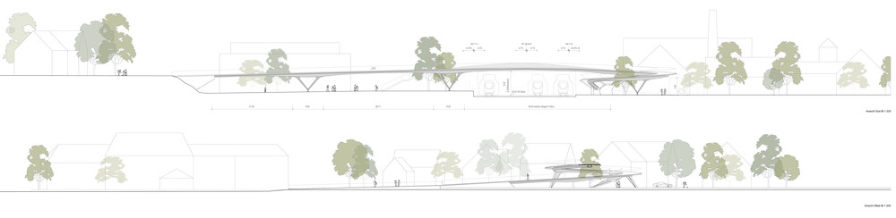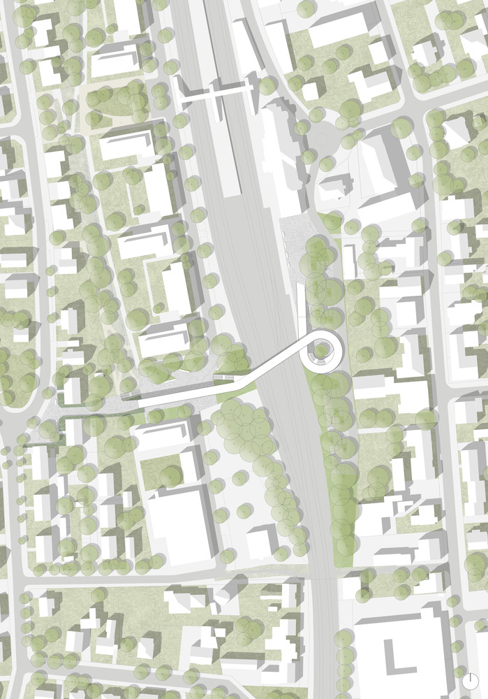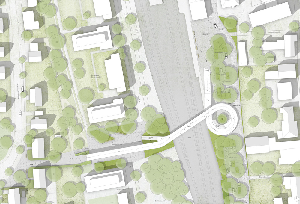 Die Stadt Bramsche plant in unmittelbarer Benachbarung zum Stadtbahnhof eine barrierefreie Brückenanbindung für Fuß- und Radverkehr. Ziel ist es die Barrierewirkung bestehender Gleisanlagen zu reduzieren und neu geplante Wohnbauflächen - westlich der Bahnanlagen - besser an den Bahnhof und die Innenstadt anzubinden. Der Wettbewerbsbeitrag nutzt das neue Brückenbauwerk zur Stärkung von Stadtraumbezügen. Plätze und Wege werden als Bezugsräume mit Eigenprofilierungen weiterentwickelt. Die neue Brücke vermittelt zwischen den bestehenden topografischen Setzungen. Baumbestand, Neupflanzungen und Nebenfunktionen - wie zum Beispiel P+R Parkplätze - werden durch das Brückenbauwerk beiläufig integriert. Die Überstellung von Pkw-Stellflächen mit Bäumen und die Einordnung einer offenen Platzfläche als Scharnier zwischen Brücke und Bahnhofsvorplatz schafft gut proportionierte Komfortflächen (Schattierung, Erreichbarkeit, Orientierung) und stärkt so den Ansatz der multimodalen Standortentwicklung. Topografie, Landschaft, Klimasensibilität und Funktionalität sind die Koordinaten der Brücke als neues, verbindendes Stadt-Landschaftsbauwerk in Bramsche.