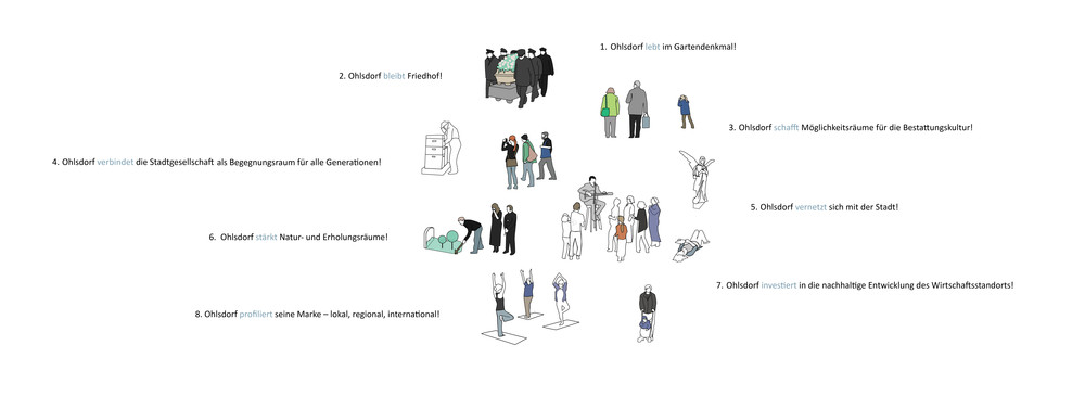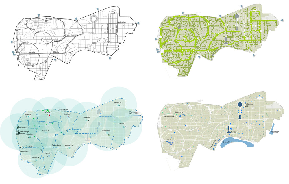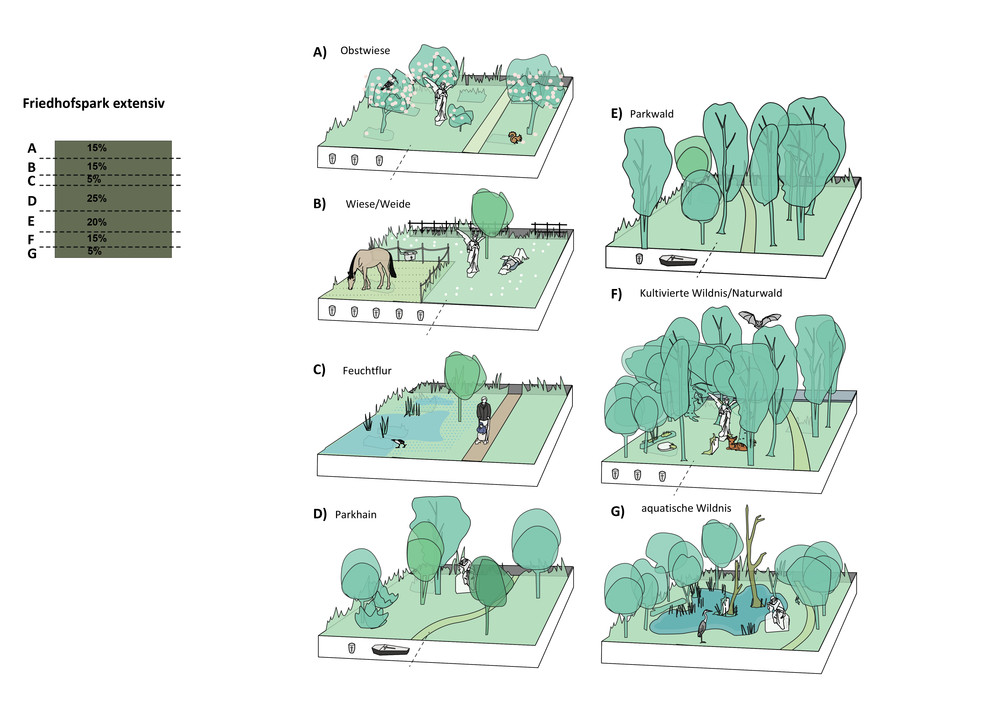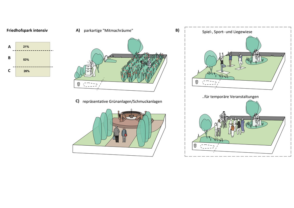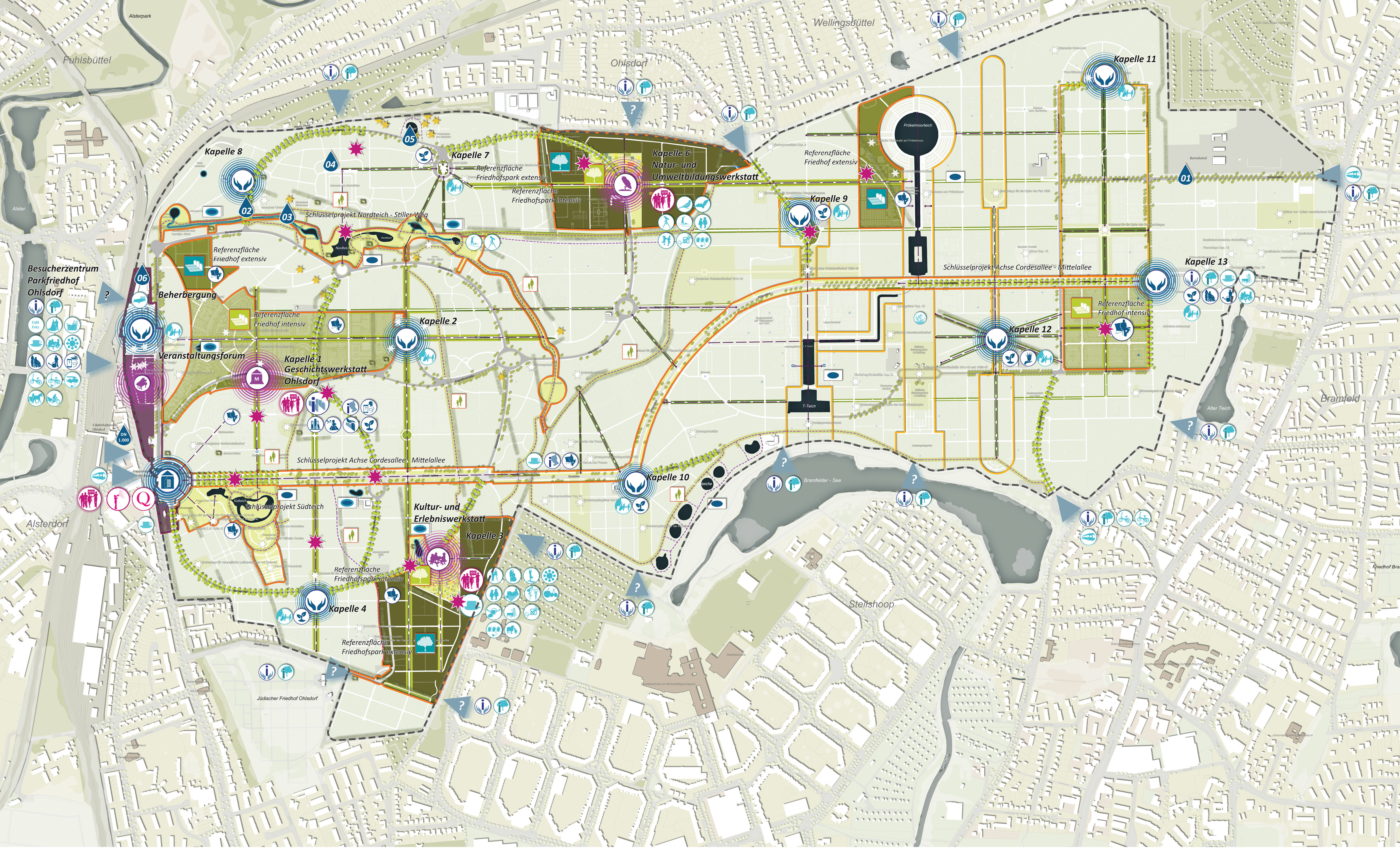 | Leistung | Masterplan, Erarbeitung der Nachhaltigkeitsstrategie zum Umbau und zur Weiterentwicklung von Parkanlage und Friedhof, Integration sozialer Stadtteilinfrastruktur, Sondernutzungen, Denkmalen und denkmalgeschütztem Gartenensemble I Pflegekonzeption |