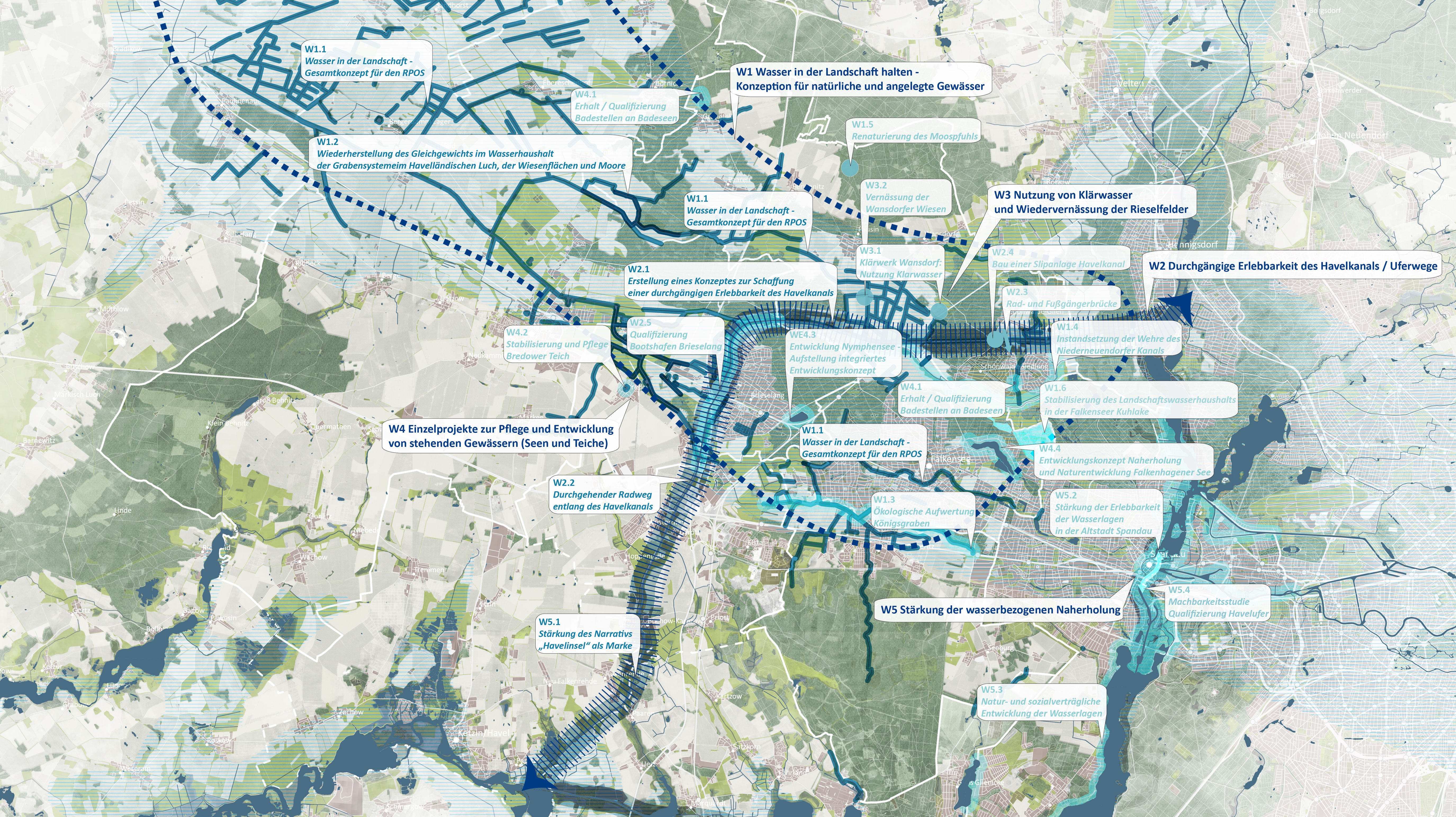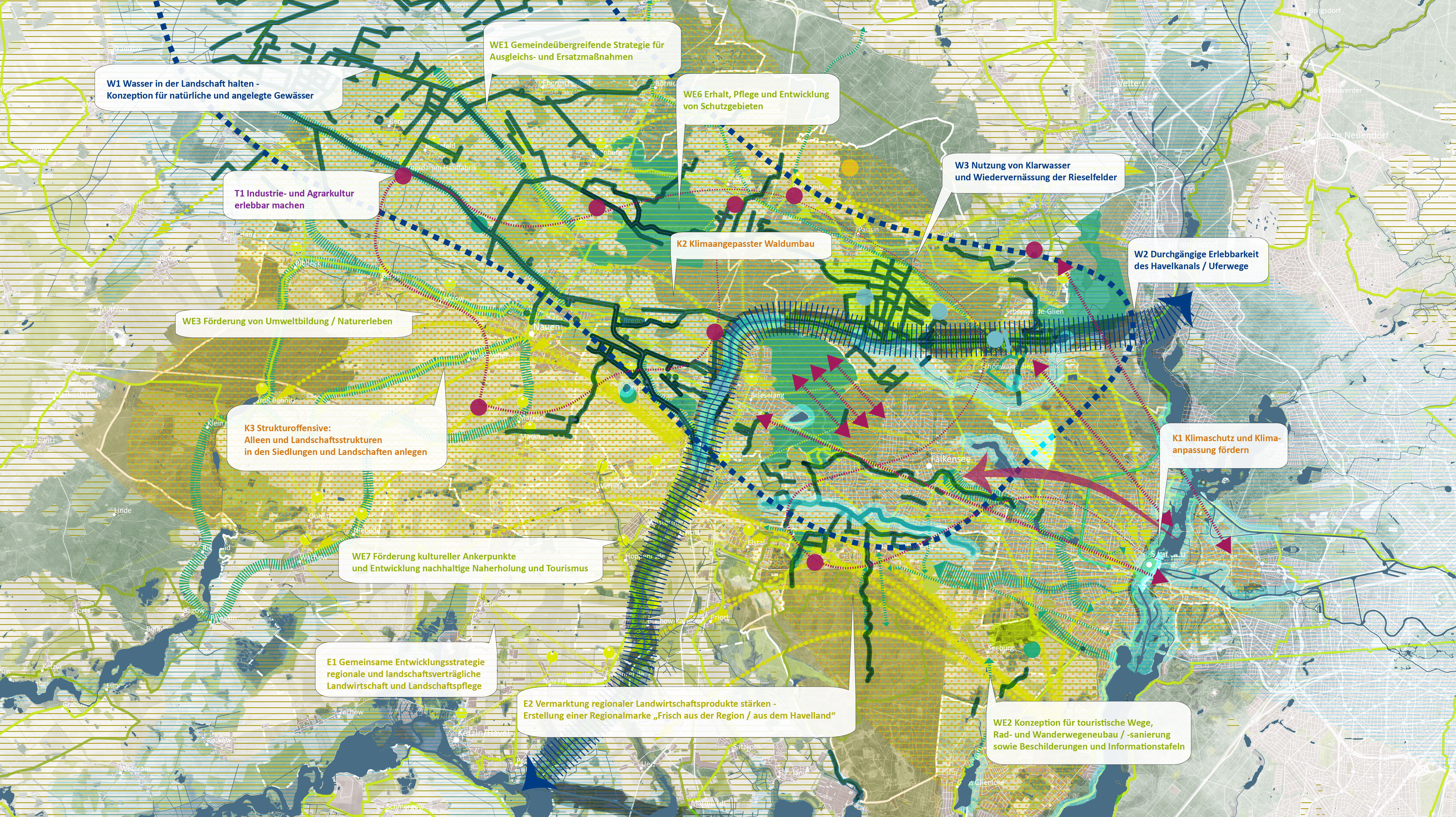 Das Entwicklungskonzept für den Regionalpark Osthavelland-Spandau ist eine räumliche Vertiefung des Masterplans Grün Berlin - Brandenburg, dem strategischen Entwicklungsansatz für alle Regionalparks rund um Berlin. Die dort entwickelten übergeordneten und untereinander verbundenen Themenländer Wasserland, Erzeugerland, Technoland, Klimaland und Wohlfühlland für Mensch und Natur werden hier auf den Regionalpark Osthavelland-Spandau heruntergebrochen und mit konkreten Projekten und Maßnahmen mit Leben gefüllt.