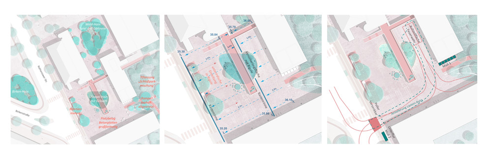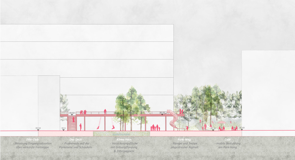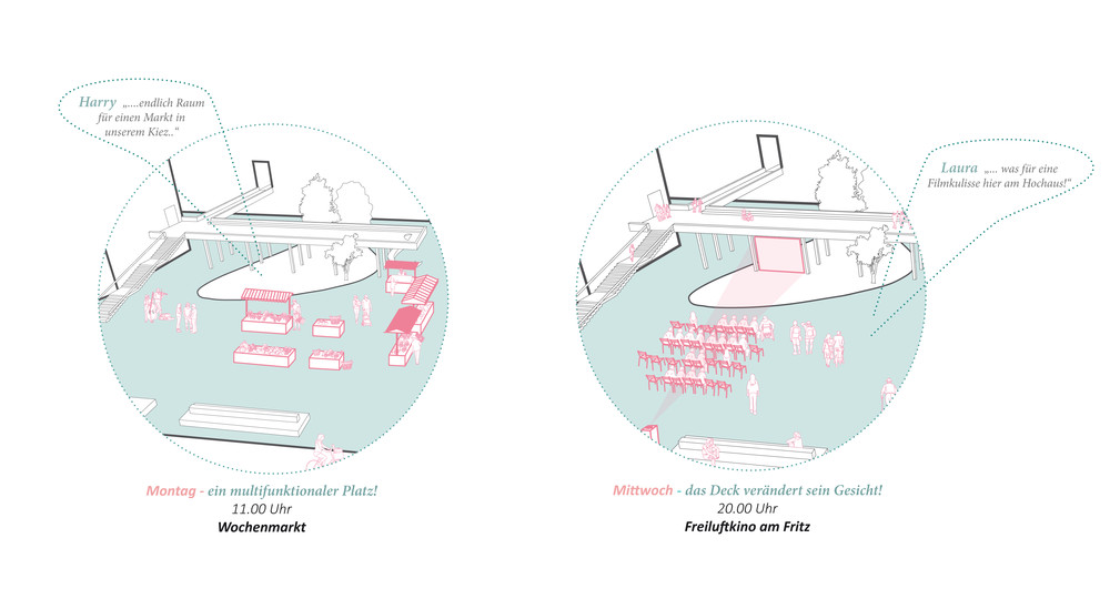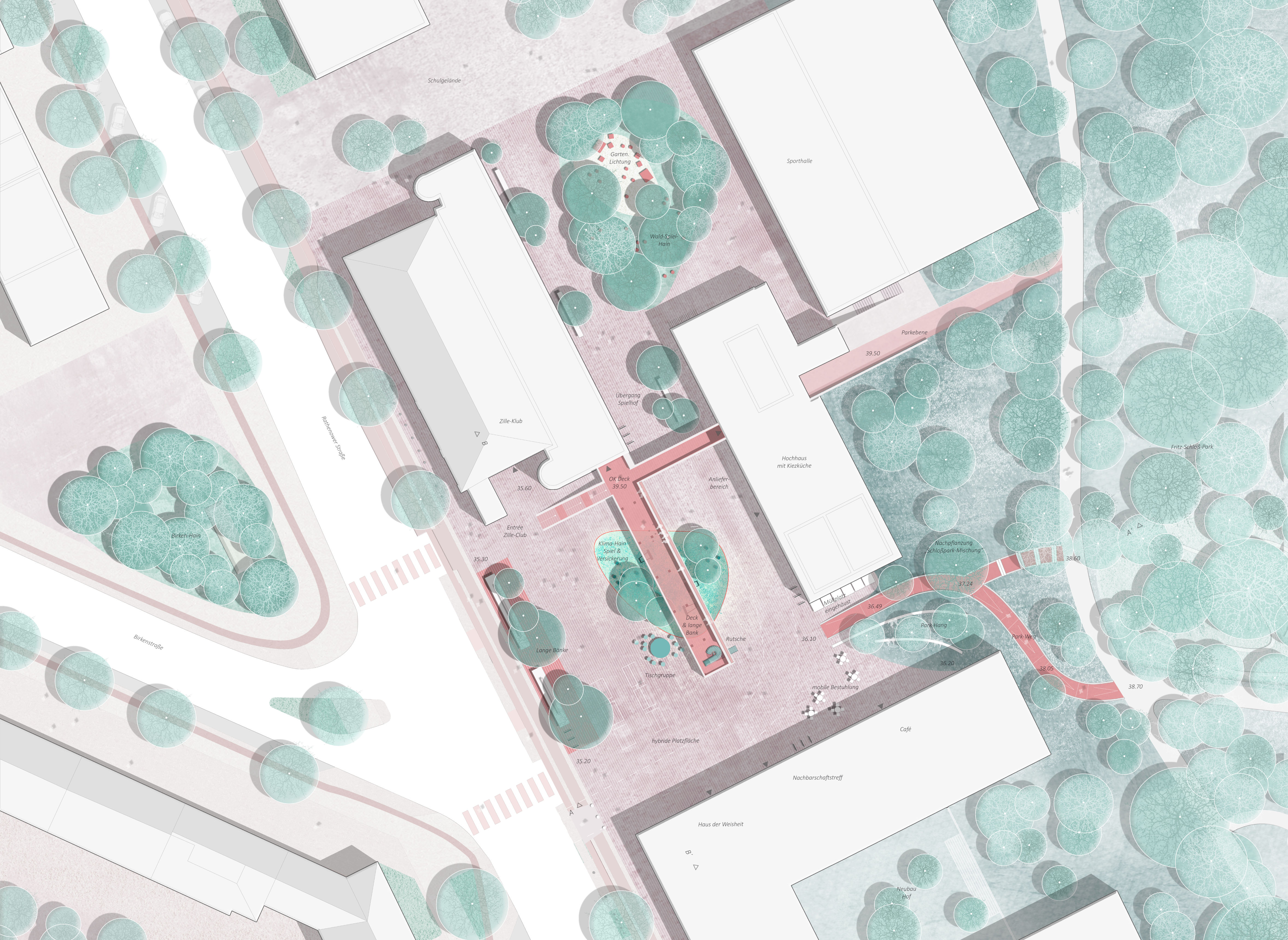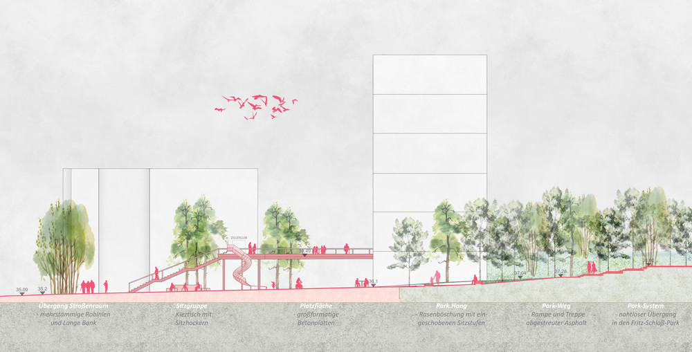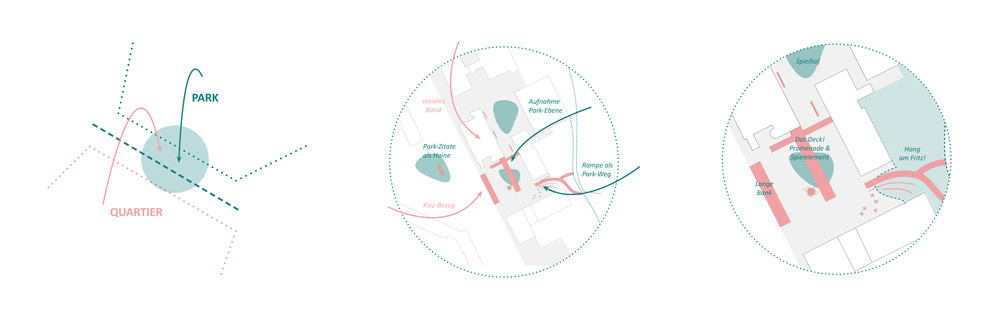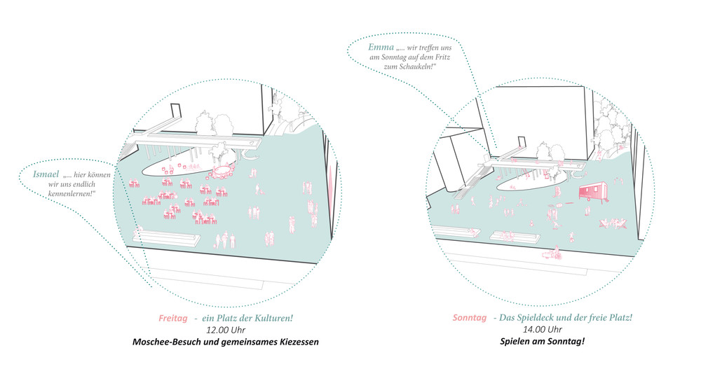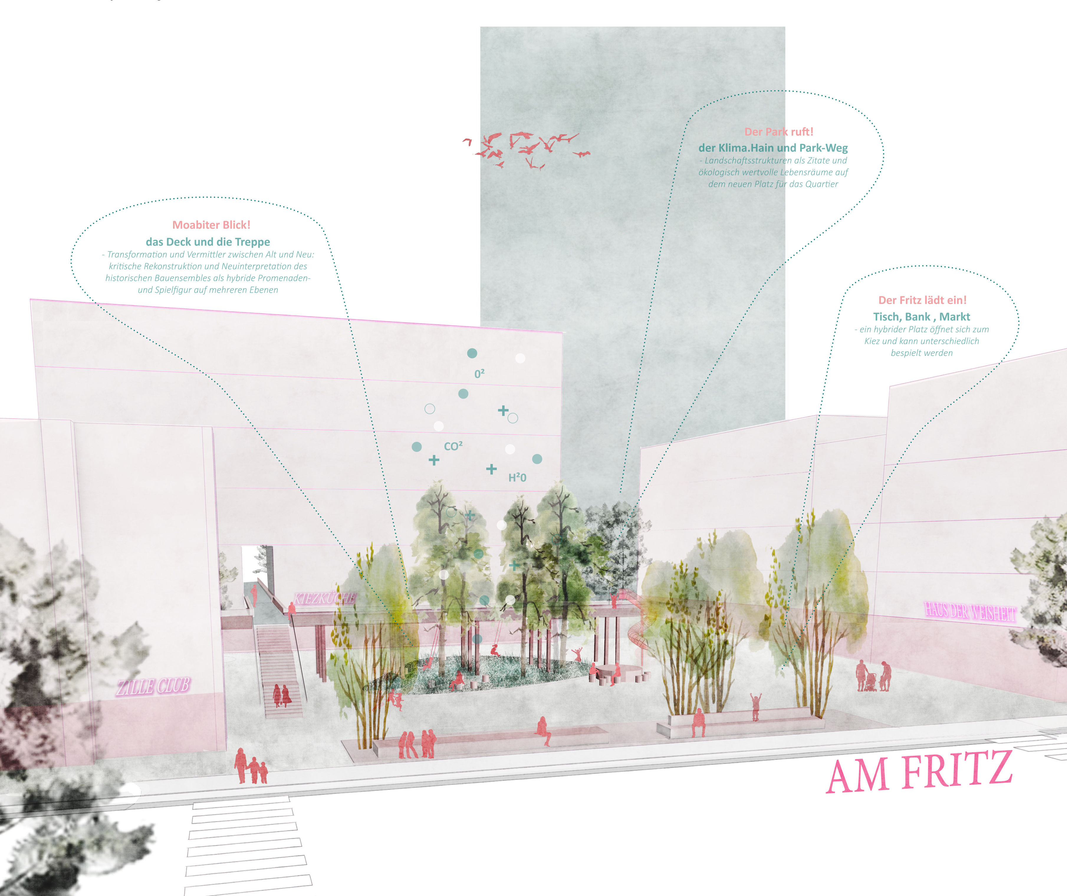 Der Entwurf, AM FRITZ, entwickelt einen hybriden Platzraum, der sich vielfältig zum Kiez und zur Landschaft öffnet und die unterschiedlichen Nutzerkonstellationen auf dem Platz und im Quartier verknüpft. Zentrales Element des neuen Platzraums ist ein Deck, das als Spielelement und Aussichtspromenade auf zwei Höhen den Fritz-Schloss-Park mit dem neuen Gebäude- und Platzensemble verbindet und den vorhandenen baulichen Bestand neu interpretiert. Über eine sanfte Rampenanlage wird der neue Platzraum spielerisch mit dem Parksystem verwoben. Baumhaine referrenzieren den angrenzenden Parkraum und strukturieren den neuen Stadtplatz. Über die Integration vielfältiger ökologischer und funktionaler Anforderungen entsteht ein multifunktionaler Platzraum, der dem Kiez als Wochenmarkt, als Leinwand für das Kiez-Kino, als Spielort, als Treffpunkt für ein gemeinsames Kiez-Essen nach dem Moschee-Besuch zur Verfügung steht.