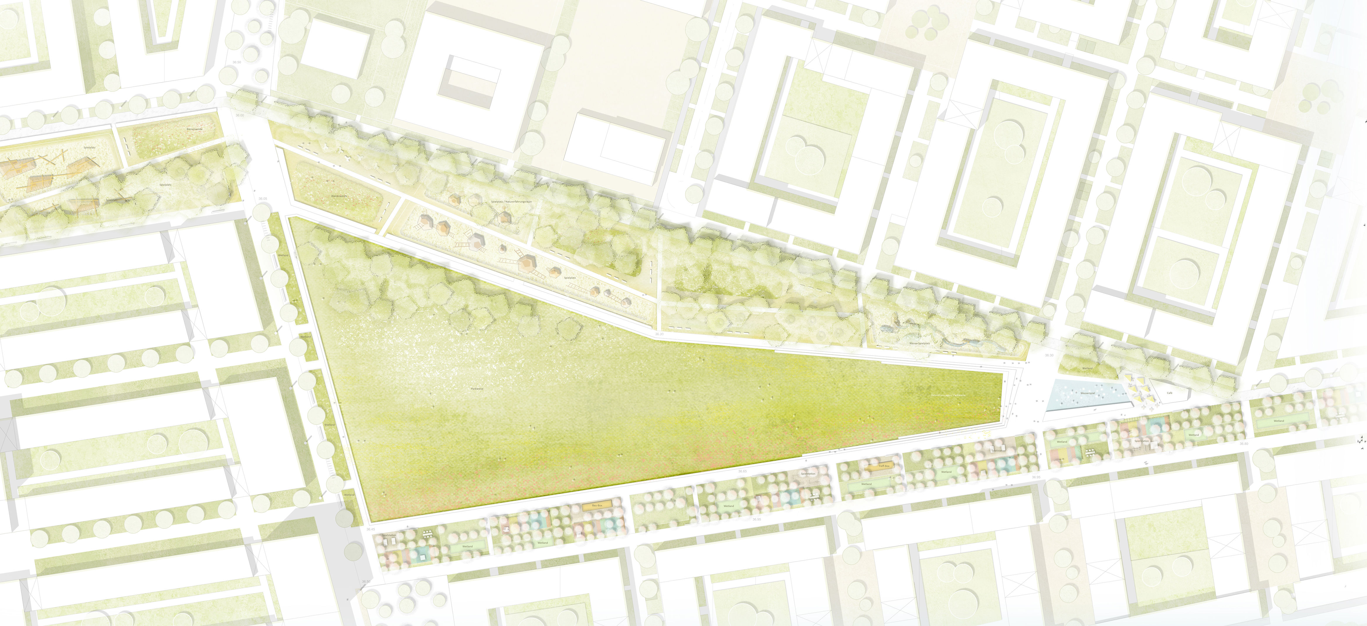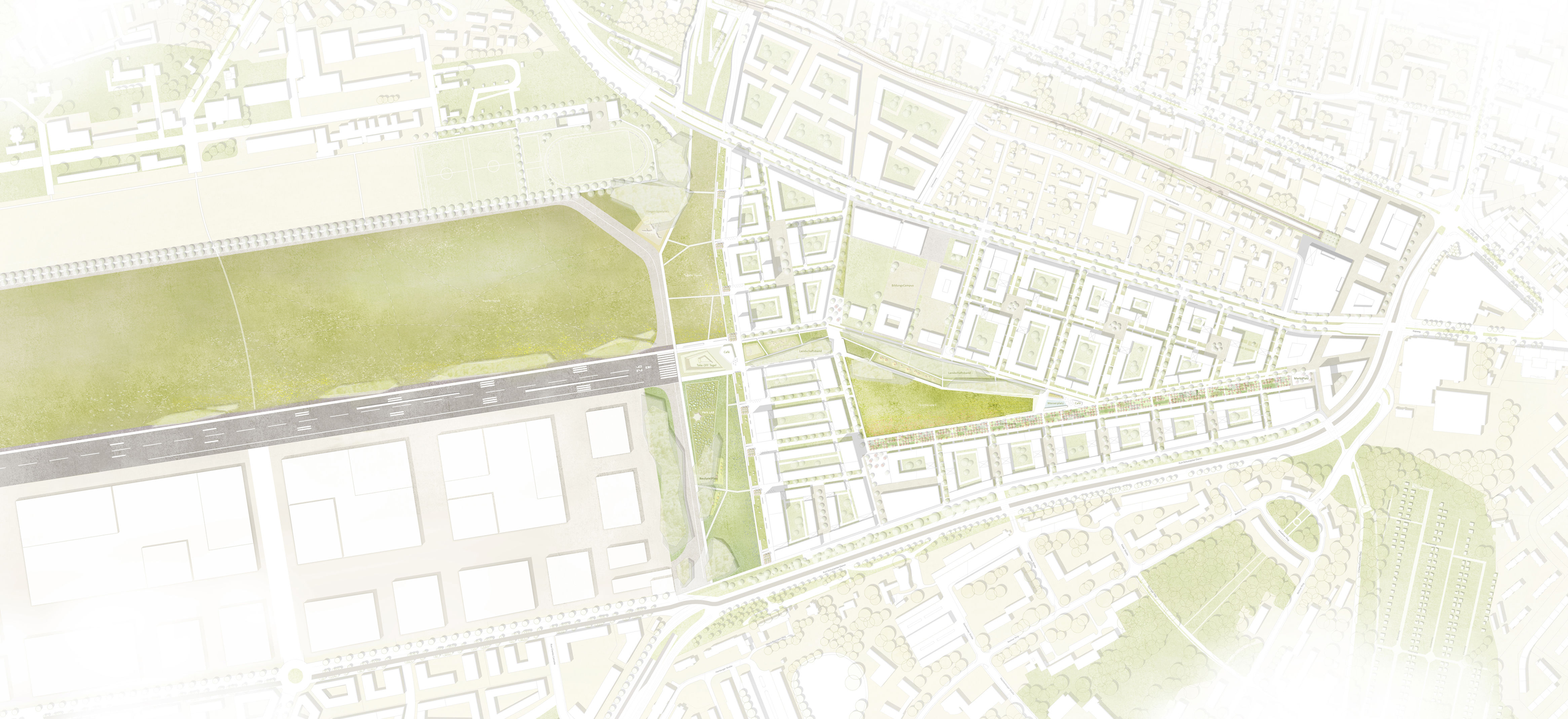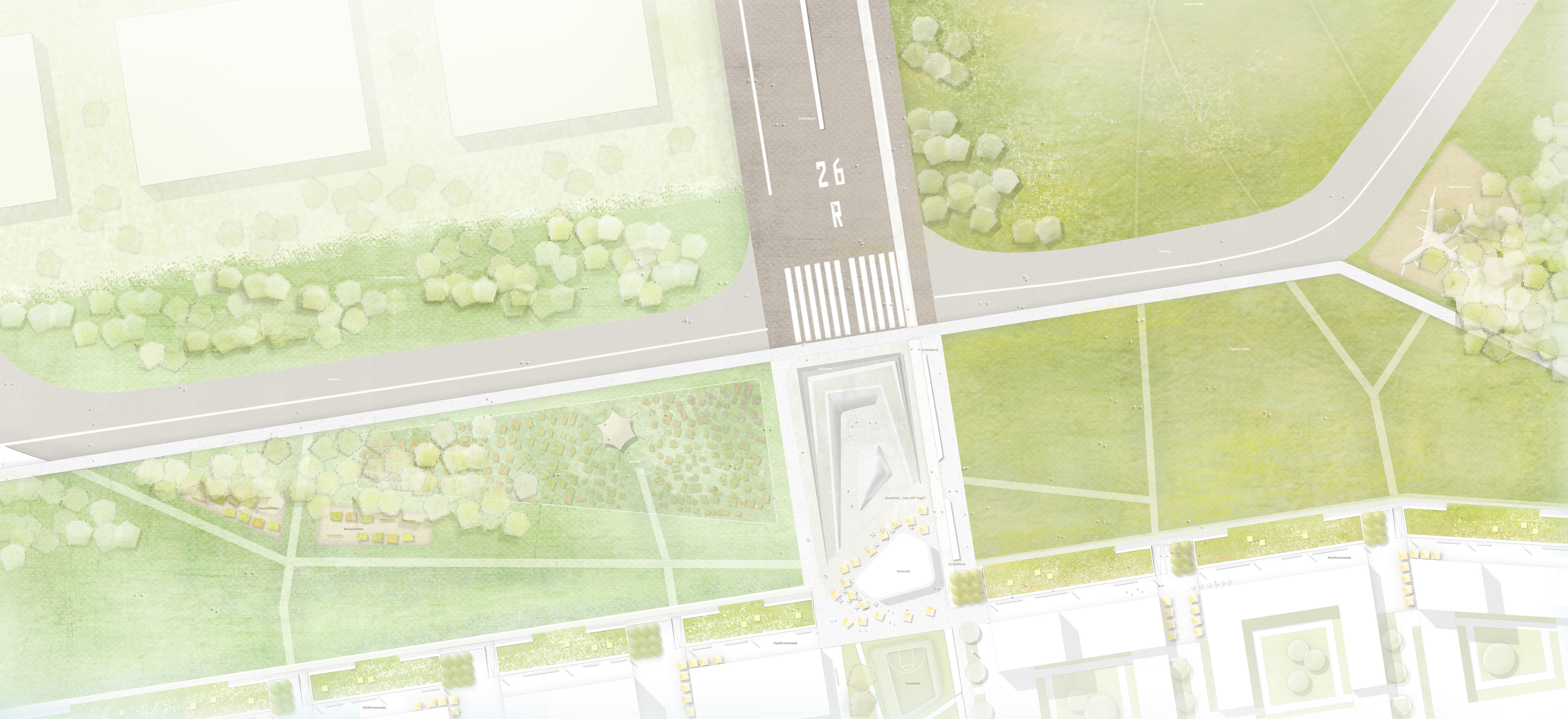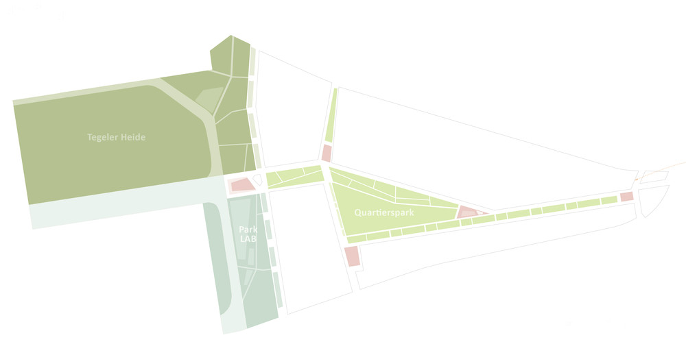 Das Schumacherquartier entsteht an der Schnittstelle zum ehemaligen Flugfeld des Flughafen Tegel in unmittelbarer Nachbarschaft zur Urban Tech Republik. Das neue Stadtquartier ist zukünftig das Bindeglied zwischen gewachsener Stadt und dem offenen Landschaftsraum der Tegeler Heide. Unser Wettbewerbsbeitrag nutzt die unterschiedlichen Dispositionsräume. Neben dem neuen Quartierspark und der Offenlandschaft der Tegeler Heide wird im Übergangsbereich zur Urban Tech Republik Tegel ein Innovationsfeld - das ParkLab – aufgespannt. Der Dreiklang von Landschaftsraum, Quartierspark und Innovationsfeld schafft spannungsvolle Schnittstellen und Verbindungsräume zwischen Stadt und Landschaft.
