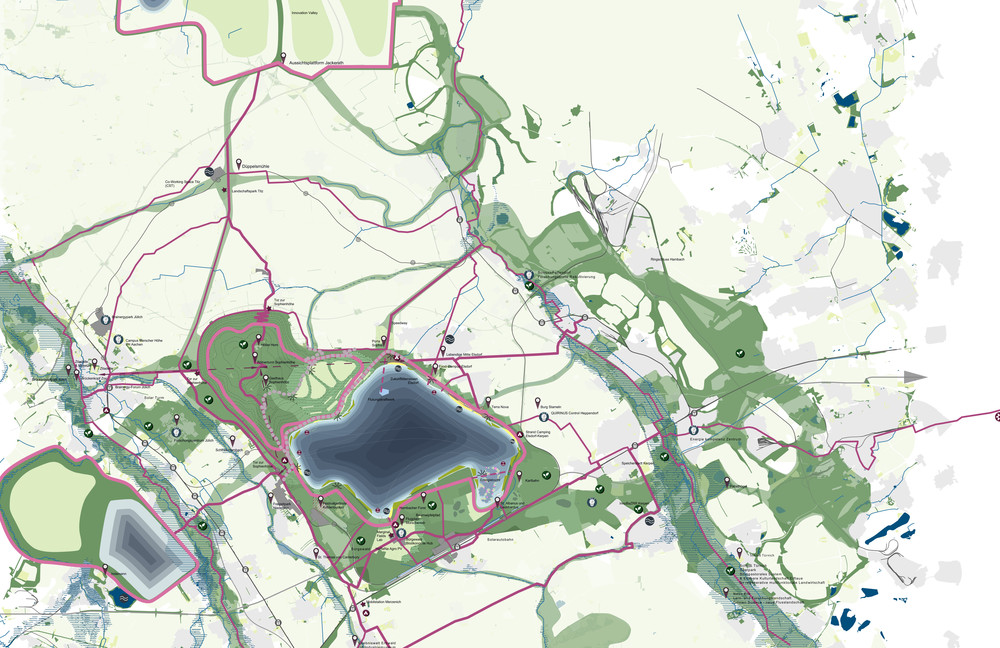 Der Prozess des Strukturwandels im Rheinischen Revier kommt in Bewegung. Mit der Raumentwicklungsperspektive formulieren die Anrainerkommunen des Tagebaus Hambach Zukunftsstrategien für den Transformationsprozess hin zu einer Seelandschaft. Zusammen mit MUST und Planersocietät hat bgmr Nutzungstypologien, Netze und Zukunftsbilder für drei Zeitphasen der Transformationslandschaft entwickelt. Im Fokus der Untersuchung stehen die nachhaltige wirtschaftliche Entwicklung, die Implementierung von Klimaanpassungsstrategien, der Aufbau zukunftsorientierter Mobilitätsnetze, Leitprojekte regenerativer Energieerzeugung, die Stärkung der produktiven Kulturlandschaft und der Aufbau eines biodiversen regionalen Bioshärenverbunds.