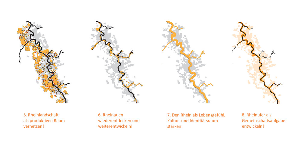 Die Region zwischen Bad Honnef und Meerbusch (120 Rheinkilometer) ist ein Wachstumsraum, der räumlich und kulturell äußerst vielschichtig ist. Der Rhein stellt das Rückgrat dieser Region dar. Begehrte Wasserlagen für die Industrie- und Kreativwirtschaft, den agrarwirtschaftlich intensiv genutzten, fruchtbaren Böden, ein zunehmender Schiffs- und Logistikverkehr und neue Wohnstandorte mit Bezug zum Fluss dokumentieren diese Bedeutung. Und: der Fluss mit seinen Natur- und Kulturlandschaften ist der Symbolträger und Identitätsraum für die Rheinländer. Am Rhein verdichten sich die unterschiedlichsten Interessen. Jeder, ob Bewohner, Autofahrer, Unternehmer, Berufsschiffer, Tourist oder Naturschützer, schaut mit dem spezifischen Blickwinkel seiner Profession auf die begehrten Lagen am und auf dem Wasser. Anstelle der sektoralen Aufteilung der knappen Lagen wird es im Sinne einer gemeinsamen Strategie zukünftig darum gehen, sie integriert und multicodiert zu entwickeln.